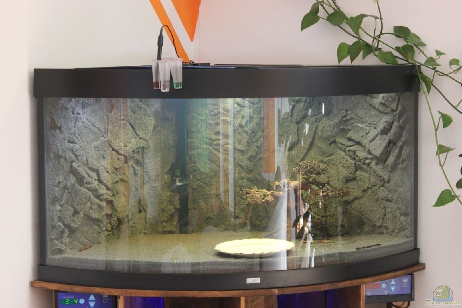 Der Unterschrank wurde selbst gemacht, die LED Beleuchtung umgerüstet. Einkaufsliste: Dennerle Duomat Deluxe inkl. JBL Bodenfluter 60W und Juwel Heizstab 300W im Becken integriert Dennerle Bodengrund Quazkies Schiefer grau Dennerle DepotMix inkl. FB1 Substrate Start Dennerle PH Control Deluxe inkl. Dennerle CO2 mit Magnetventil Juwel Strukturrückwand Schiefer grau Juwel Trigon schwarz Edelstahl UVC Klärer im Filter JBL Futterautomat aPump Nanoluftpumpe
