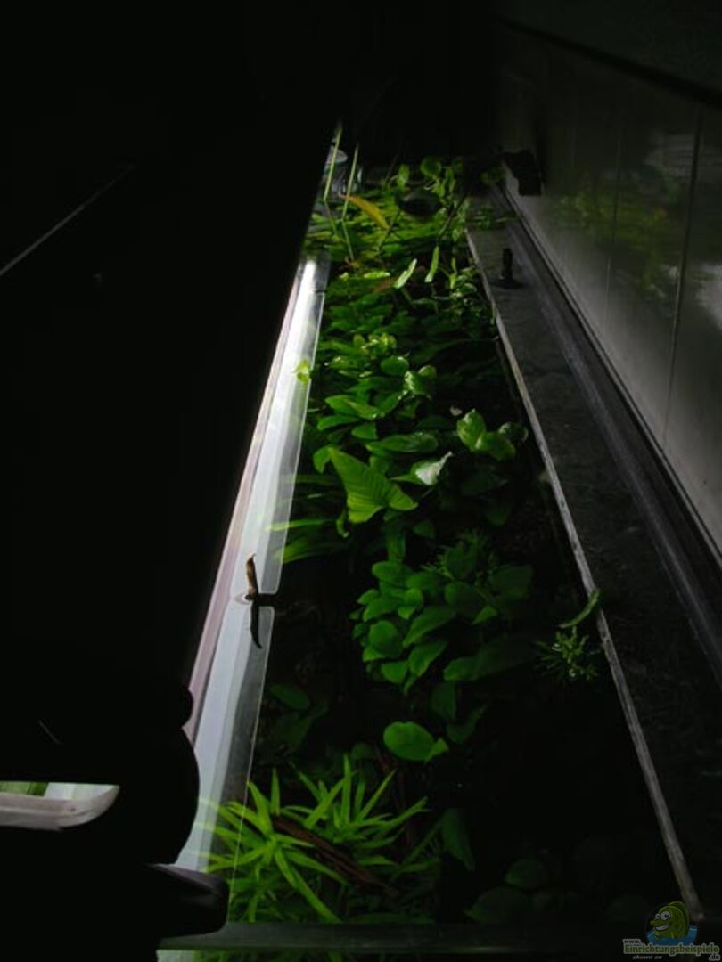 Offenes Becken ohne Mittelsteg, 15 mm Glas Die Rückwand ist komplett mit Lavagestein beklebt. Die Steine sind an der Rückwand und in sich selber verklebt. Das ganze ist zum gro??en Teil mit Anubias nana, Anubias hastifolia, Anubias gracilis, Microsorium pteropus und Pogostemon helferi bepflanzt. Das Wasser aus dem Filter kommt auf die ganze Lange hinter der Rückwand ins Becken. Nachteil: Das nimmt zwar einiges an Schwimmraum aber wenn der Hintergrund richtig dicht bepflanzt ist kann [...]