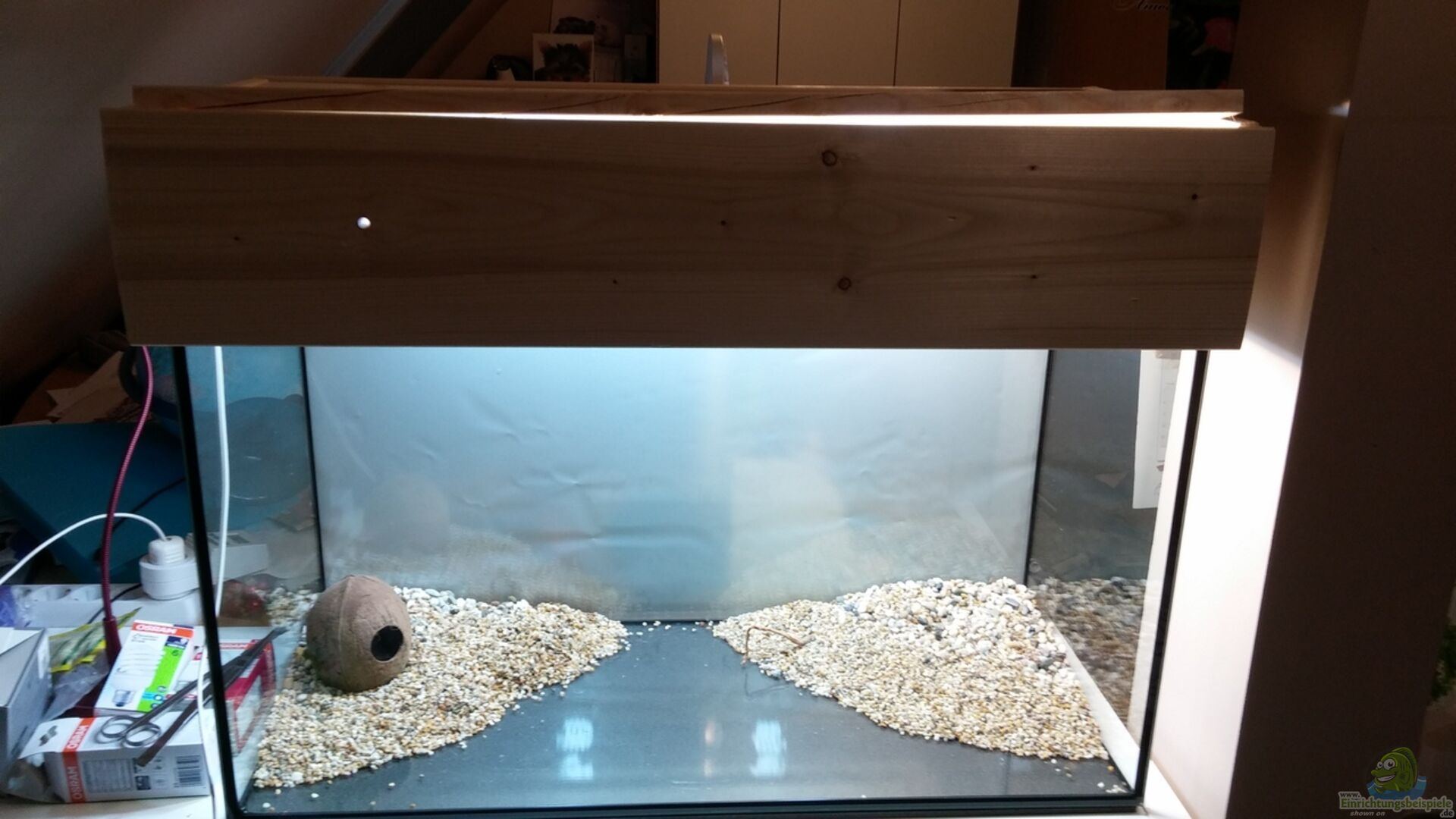 Eheim 126l Aquarium. Ohne Längsstreben. Mit schwarzem Silikon. Eine selbst gebastelte Abdeckung aus Vollholz mit Futterluke . Als Rückwand dient eine statisch klebende Milchglasfolie aus dem Baumarkt. Au??en vorne und hinten 2 Stahlbleche angeschraubt. An ihnen werden nachher Magnete ihren Platz erhalten.