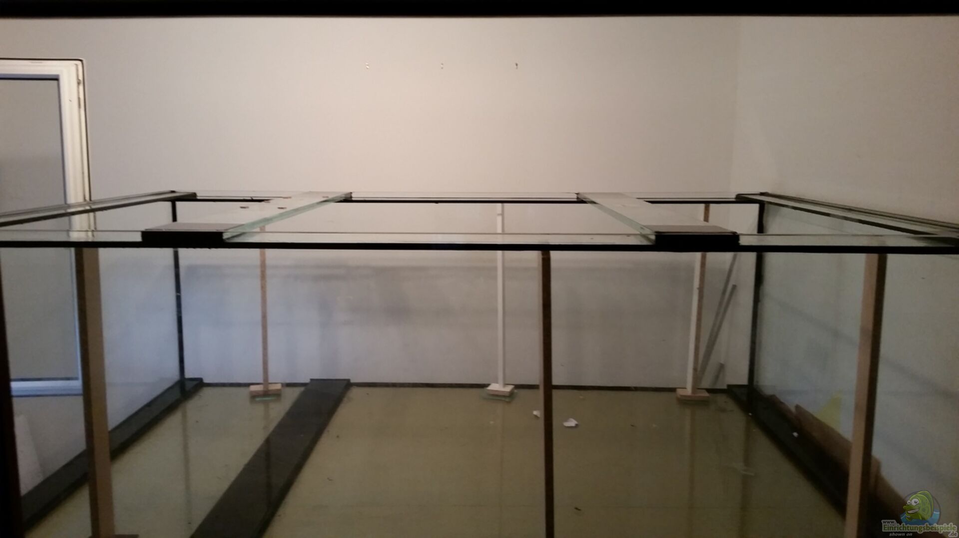 Das Aquarium ist aus 19mm Glas in Optik White, Vollschliff und wird Vorortverklebt, die Bodenscheibe ist geteilt