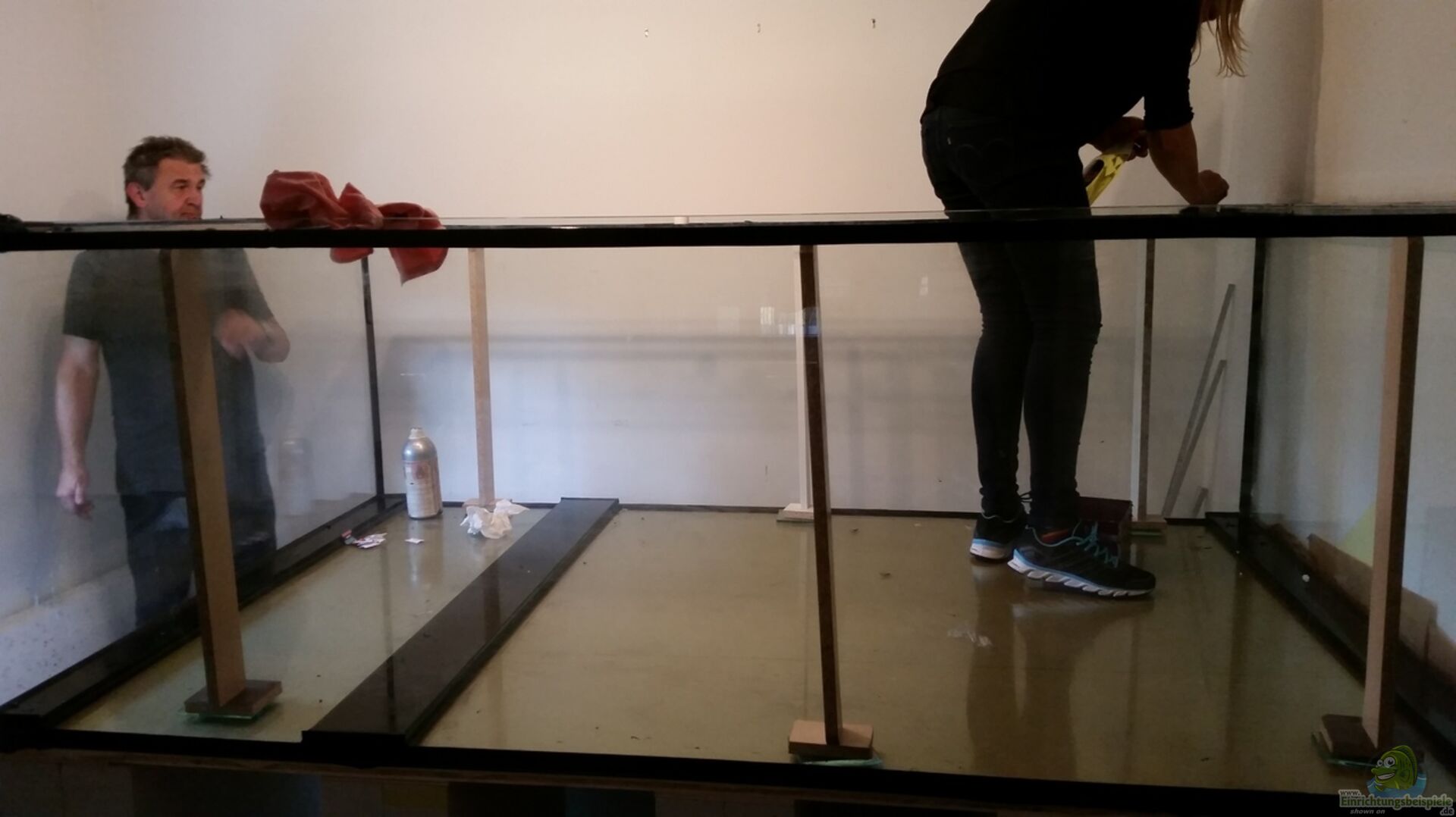 Das Aquarium ist aus 19mm Glas in Optik White, Vollschliff und wird Vorortverklebt, die Bodenscheibe ist geteilt