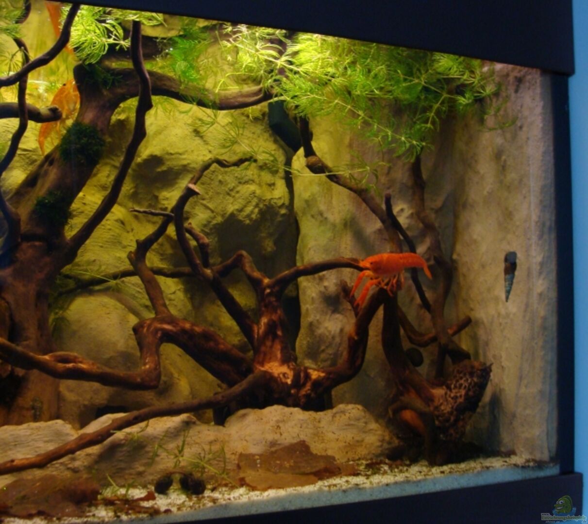 Standard-Glasbecken, Kiesblende und Abdeckung (die obere Wasserlinie und der entstehende Kalkrand sind somit nicht zu sehen) mit der Beleuchtung von einem alten Juwel-Becken übernommen, passend lackiert. Rück- und Seitenwände selber gebaut aus Styrodur und eingefärbtem (Abtönfarbe) Portlandzement, mehrere Höhlen für einen ausgewachsenen Krebs und eine Aussichtsplattform integriert, der Innenfilter ist komplett verkleidet, der Wasserauslauf des Innenfilters ist aus dem Becken herausgeführt, [...]