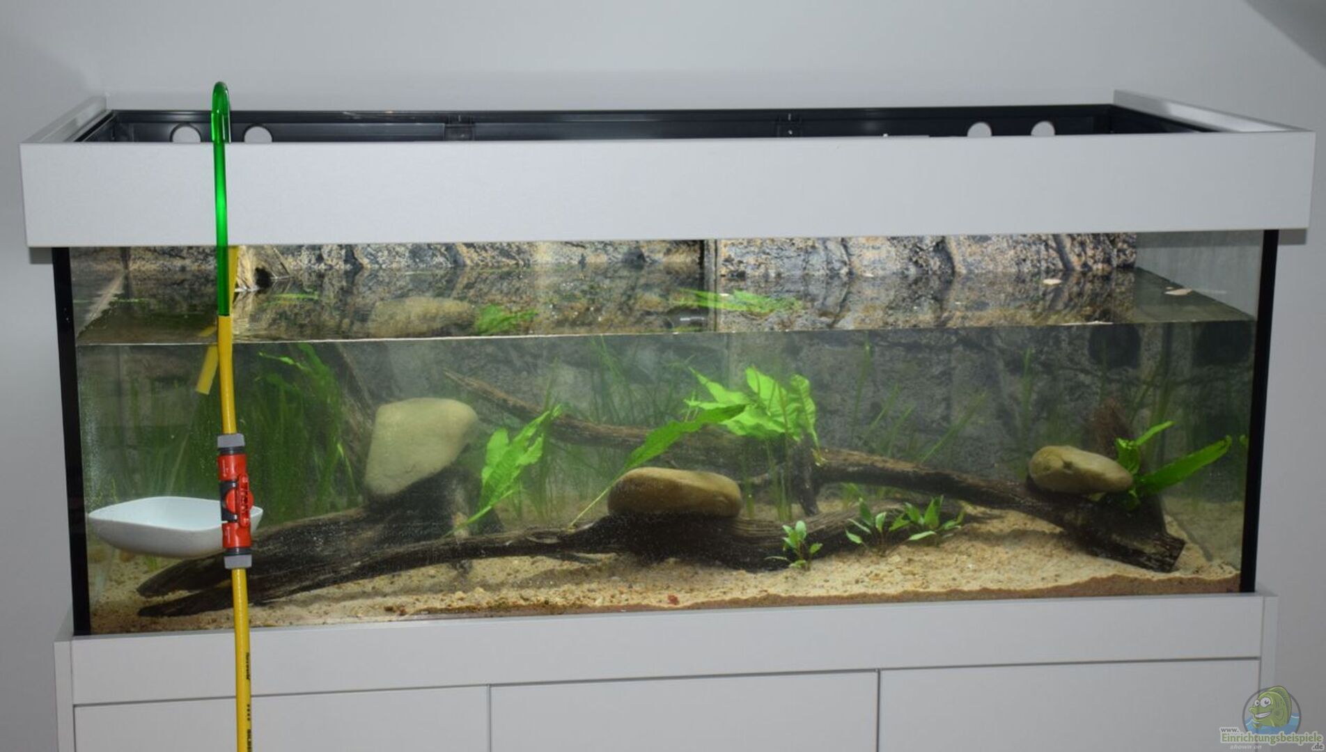 Im Becken ist ein Drei-Kammer-Innenfilter verbaut. Durch die Verkleidung mit einer 3D-Rückwand (Nature-Stone Modul Rückwand Slim-Rock XL) ist von der Technik nichts zu sehen.