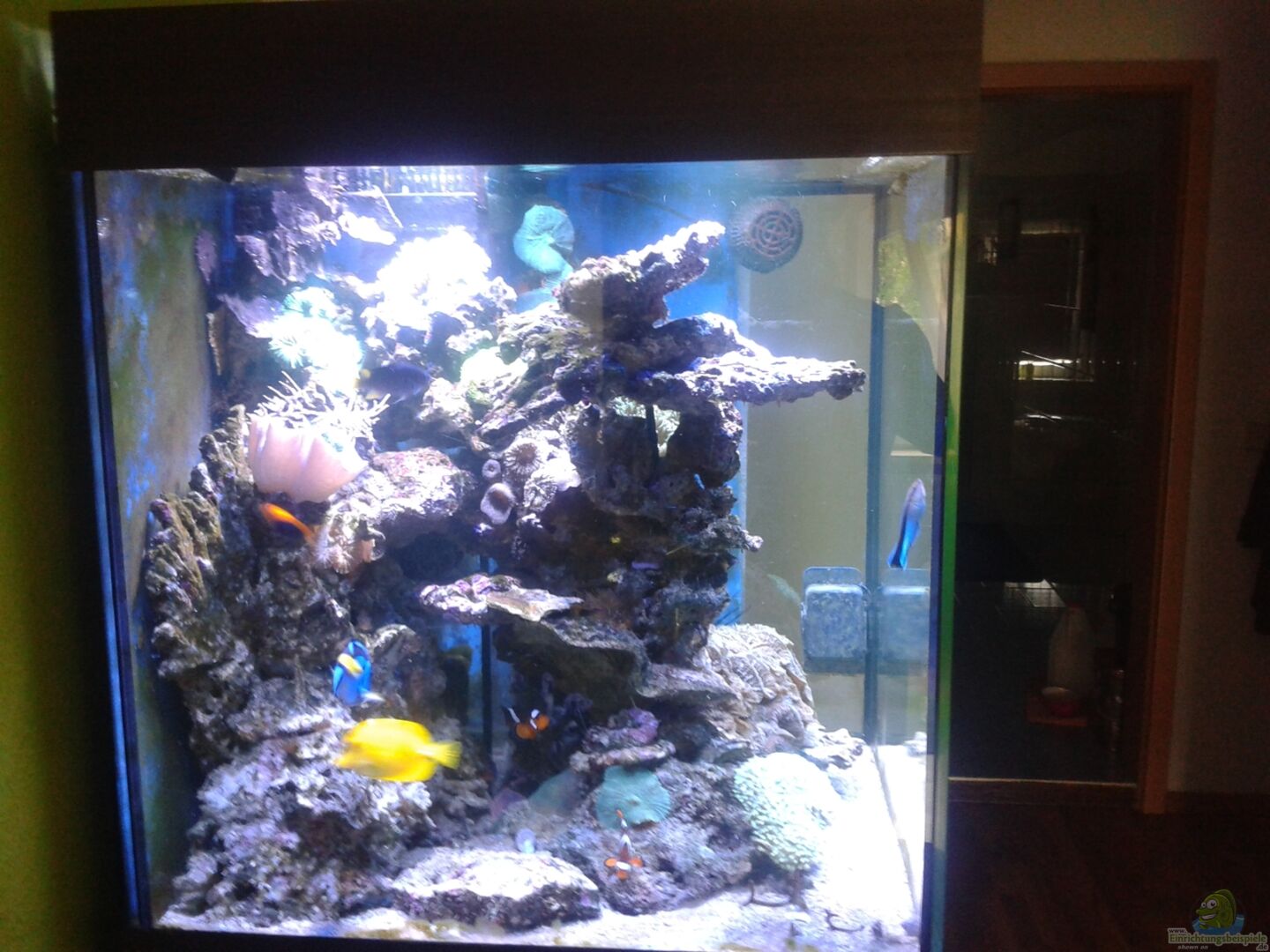 Scubacube Sü??wasser version umgebaut auf Meerwasser! Ablaufschacht um original Ablauf geklebt und diesen etwas modifiziert. .. Selbst konstruiertes Technikbecken. Gesamtvolumen ca 330l.