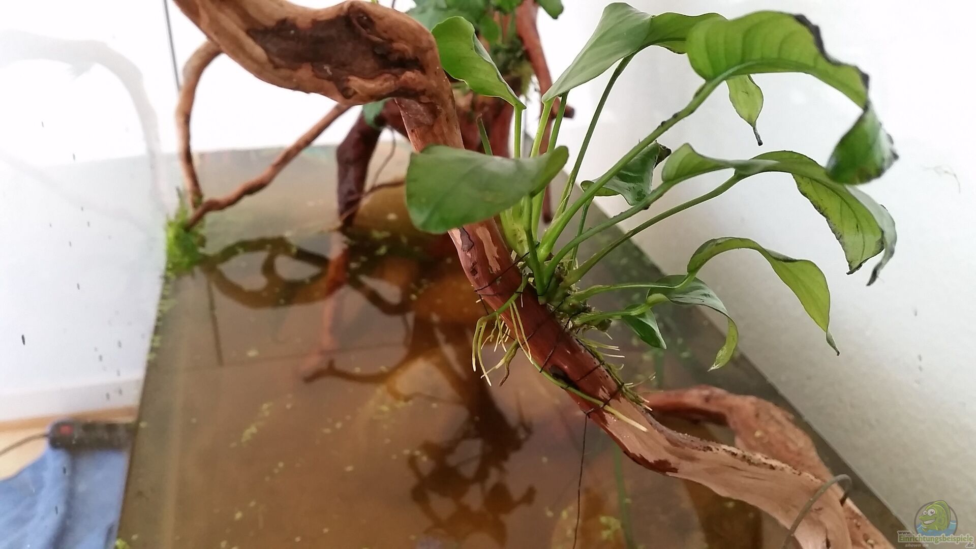 Die Rückwand besteht aus einer simplen Styroporplatte, welche ich schwarz besprayed und dann hinter dem Glas befestigt hatte. Ich musste zum Glück nichts leimen, da die Platte durch die Schläuche am Glas gehalten werden. Da die Platte hinter dem Glas sind verliere ich keinen Platz im Becken, muss mir keine Sorgen um eingeklemmte Tiere oder um Giftstoffe machen.