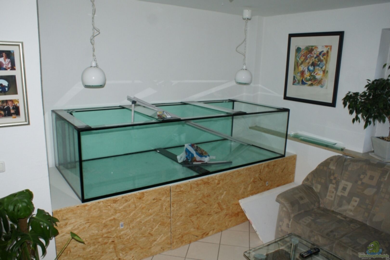 Vor Ort Verklebung mit getrennter Bodenplatte Ablaufschacht 17x17 links 2 Bodenbohrungen (einmal 40er im Ablaufschacht und einmal 20er als Zulauf) Glasabdeckplatten Untergestell aus Stahl mit Holzverkleidung links und rechts des Beckens jeweils ein Balkonpflanzenkasten von aussen angesetzt um auch dort noch Pflanzen kultivieren zu können.