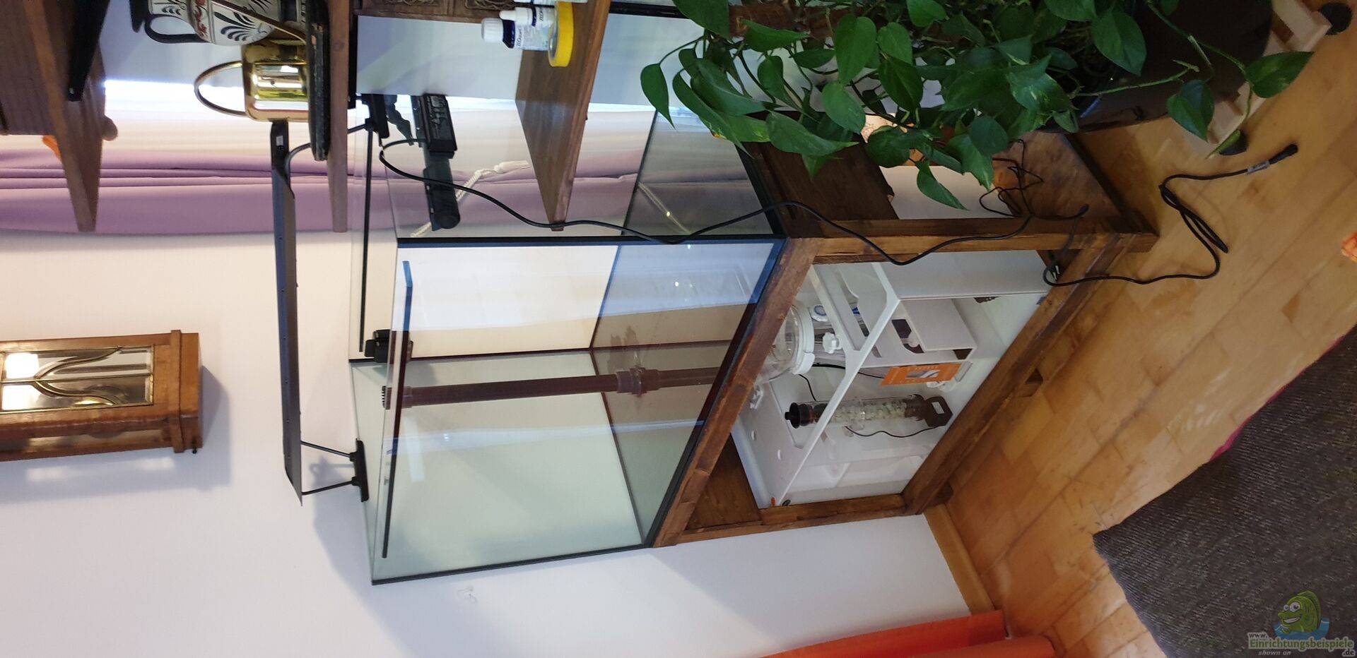 Raumteiler (see through rimless) Becken wir mit einem 100 Liter Technikbecken betrieben und die Ab- und Zuflüsse sind selbst gebohrt. Das Becken besteht nur aus künstlichen Riffgestein und Nachzuchten um es nachhaltig zu betrieben, was aber die Einlaufzeit sicher erhöhte.