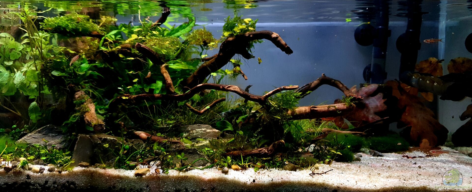 Besonders flaches Rechteck-Aquarium mit 17 Liter Inhalt und abgerundeten Ecken an der Frontscheibe. Hergestellt aus besonders hochwertigem Floatglas(Hersteller Blau Aquaristic) Erstes Aquascape/Naturaquarium, das einen seichten Nebenfluss darstellen soll bei dem Wurzeln hineinragen und eine dichte Randbepflanzung aufweisst und durch die Bepflanzung und Schwimmpflanzen teilweise beschattet wird.