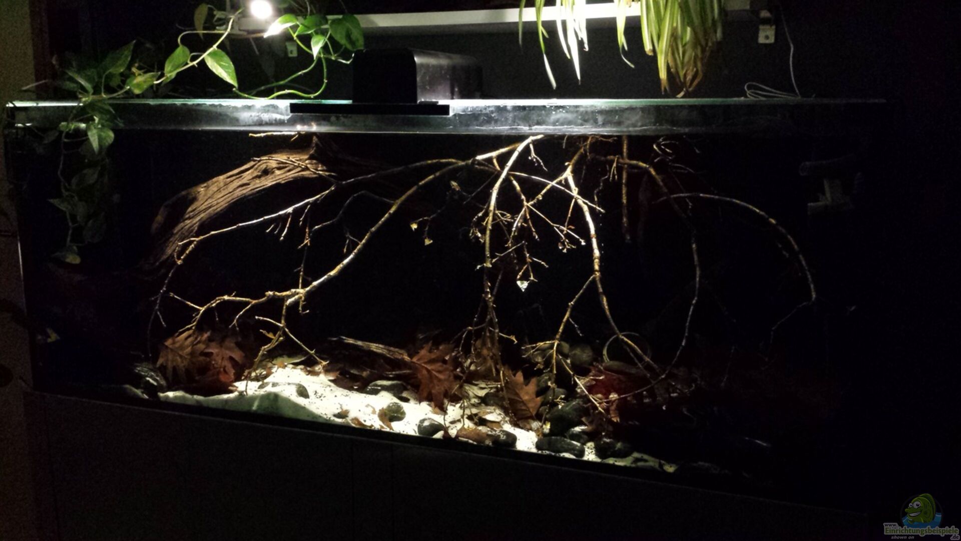- Wulstverklebtes Aquarium mit breitem Mittelsteg, 10 mm Glasstärke - 4 angepasste Abdeckscheiben, hinten 2 x ca. 40 cm, vorn 2 x ca. 20 cm tief - Unterschrank angefertigt vom Metallbauer, feuerverzinktes Stahlgestell, Verkleidung mit Edelstahlplatten - Front mit vier Edelstahltüren; rechts gro??er Metallauszug zum Herausfahren des Topffilters