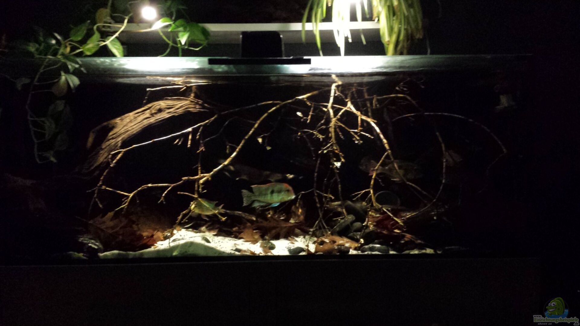 - Wulstverklebtes Aquarium mit breitem Mittelsteg, 10 mm Glasstärke - 4 angepasste Abdeckscheiben, hinten 2 x ca. 40 cm, vorn 2 x ca. 20 cm tief - Unterschrank angefertigt vom Metallbauer, feuerverzinktes Stahlgestell, Verkleidung mit Edelstahlplatten - Front mit vier Edelstahltüren; rechts gro??er Metallauszug zum Herausfahren des Topffilters