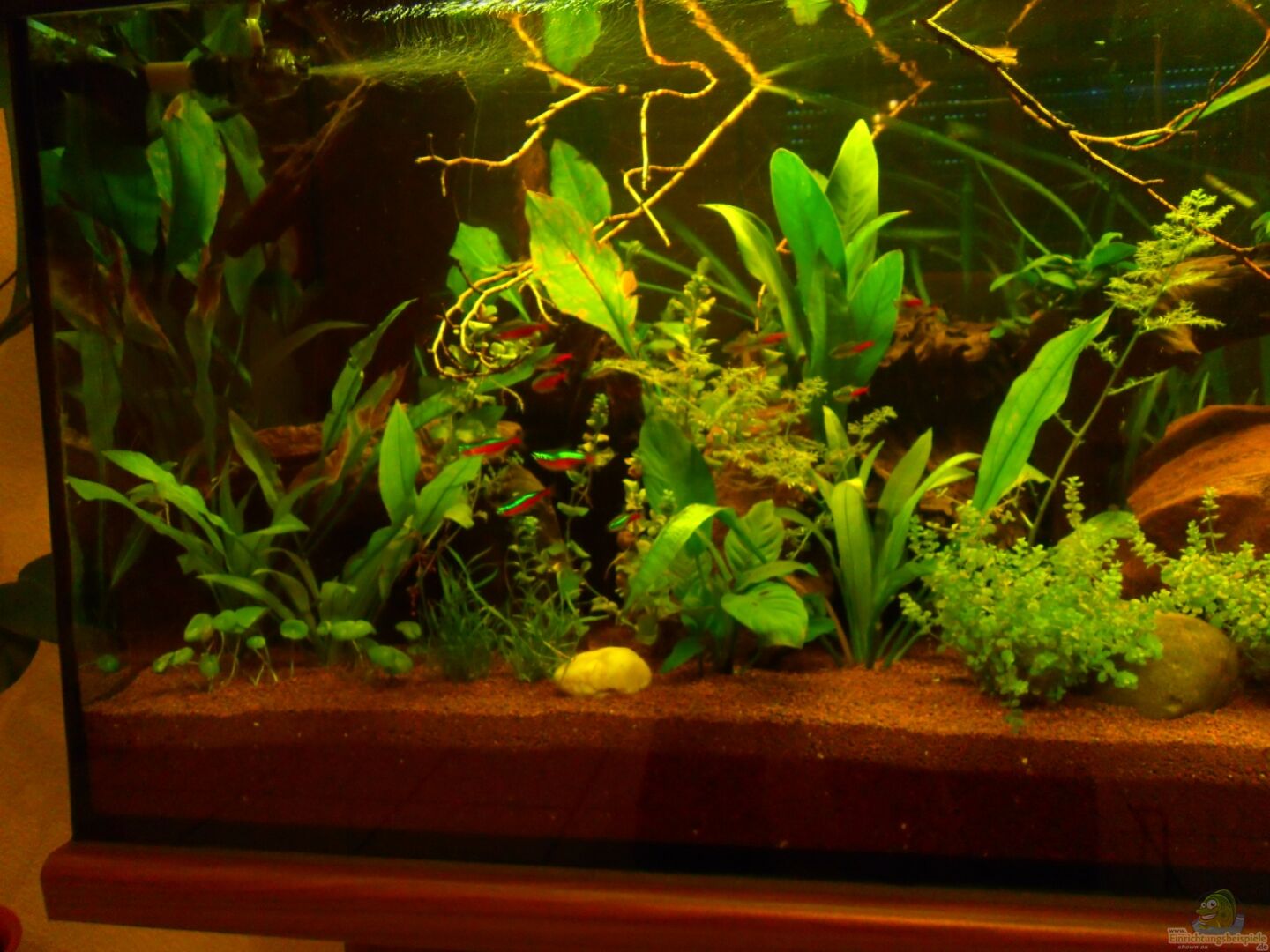 Aquariumschrank ist ein Eigenbau aus Arbeitsplatten in Nussbaumoptik. Die Rückwand ist einfach ein zugeschnittener Karton, den ich schwarz angestrichen habe. Das macht einen tiefern eindruck und der Hamburger Mattenfilter fällt auch nicht mehr so auf. Entschuldigt die teilweise schlechte Bildqualität. Viele Bilder wurden mit der Handykamera aufgenommen.