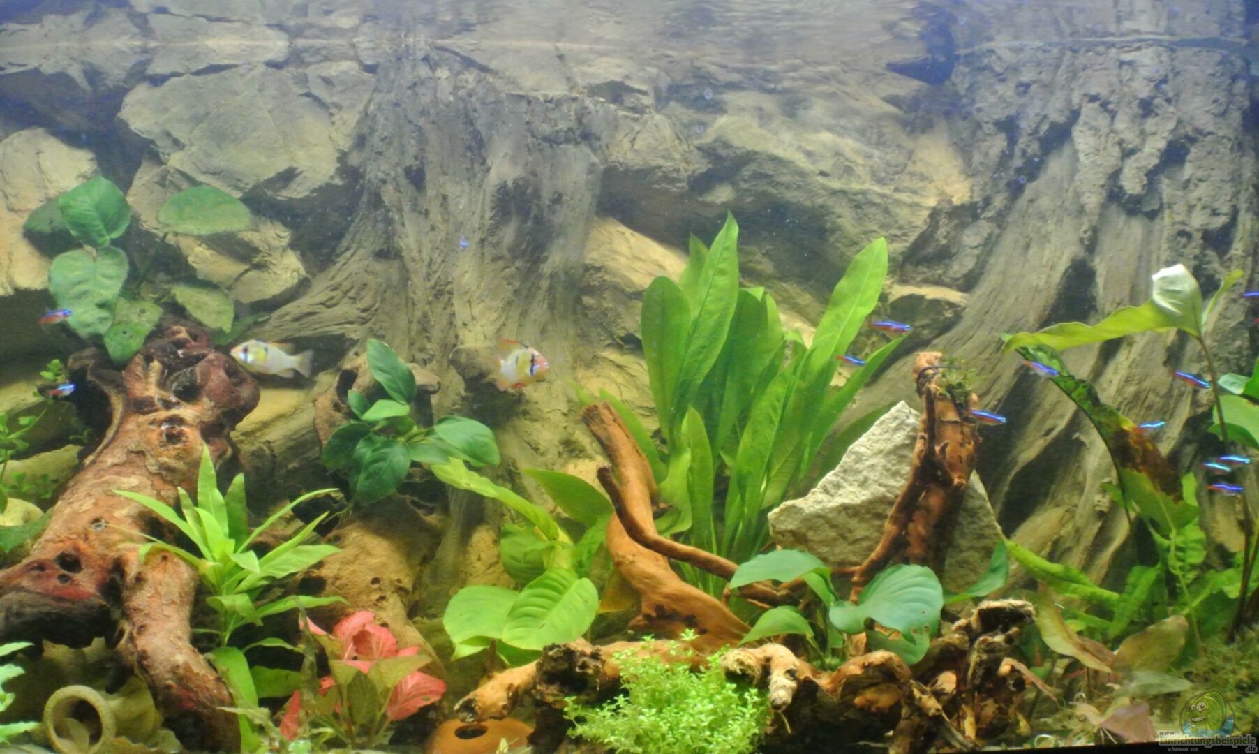 Das Becken hat eine handangefertigte Rückwand, die Felsen und Holz imitiert. Dahinter befindet sich der Heizstab und der Ansauger der Pumpe. Auch können die Fische die Rückwand hinterschwimmen und haben somit eine gute Rückzugmöglichkeit.
