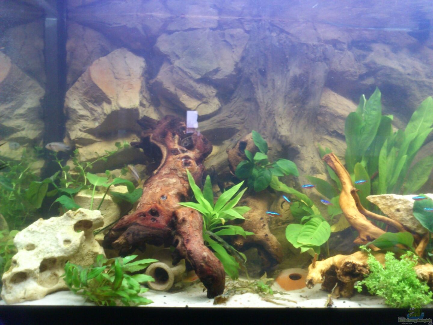 Das Becken hat eine handangefertigte Rückwand, die Felsen und Holz imitiert. Dahinter befindet sich der Heizstab und der Ansauger der Pumpe. Auch können die Fische die Rückwand hinterschwimmen und haben somit eine gute Rückzugmöglichkeit.