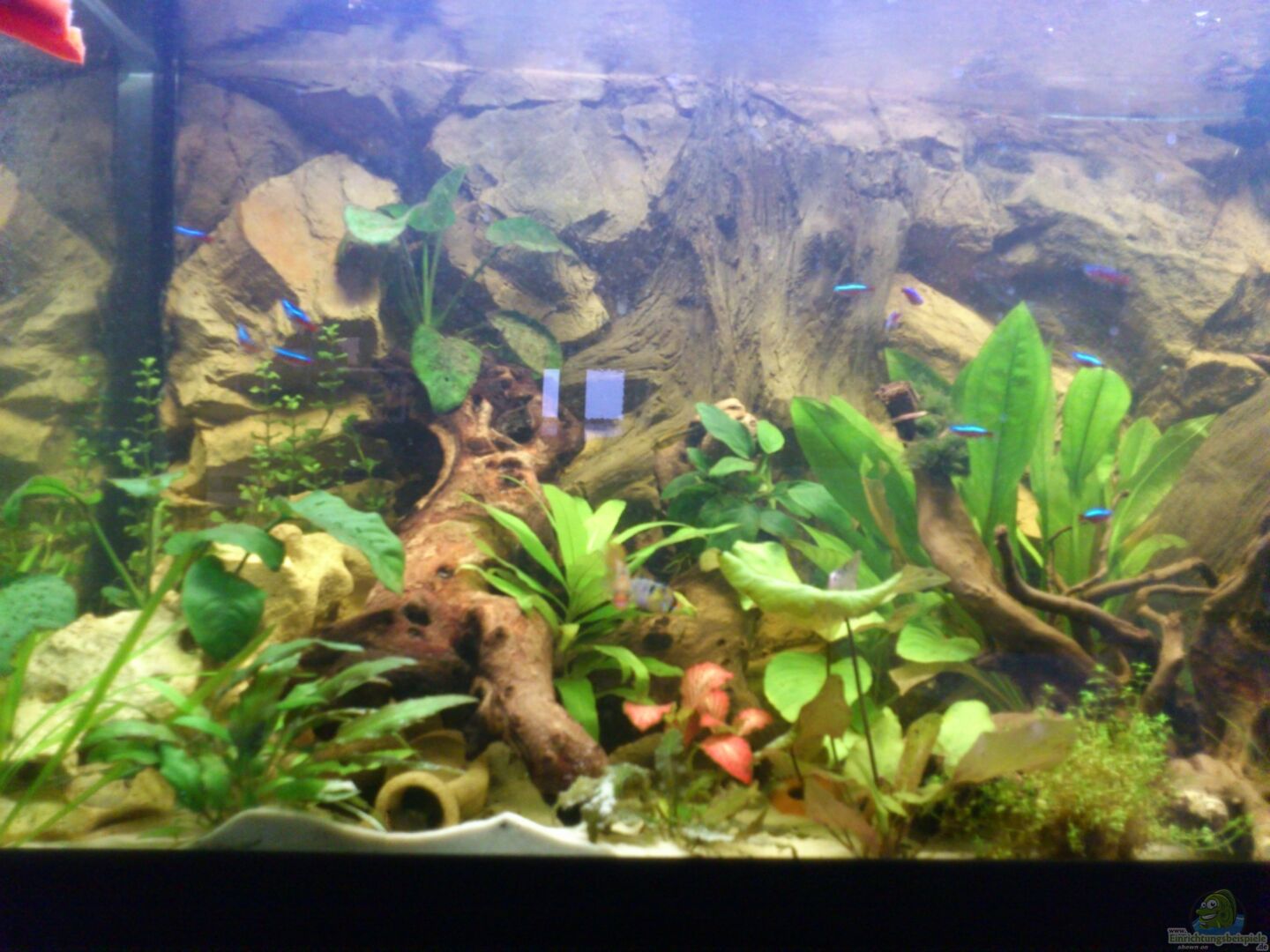 Das Becken hat eine handangefertigte Rückwand, die Felsen und Holz imitiert. Dahinter befindet sich der Heizstab und der Ansauger der Pumpe. Auch können die Fische die Rückwand hinterschwimmen und haben somit eine gute Rückzugmöglichkeit.
