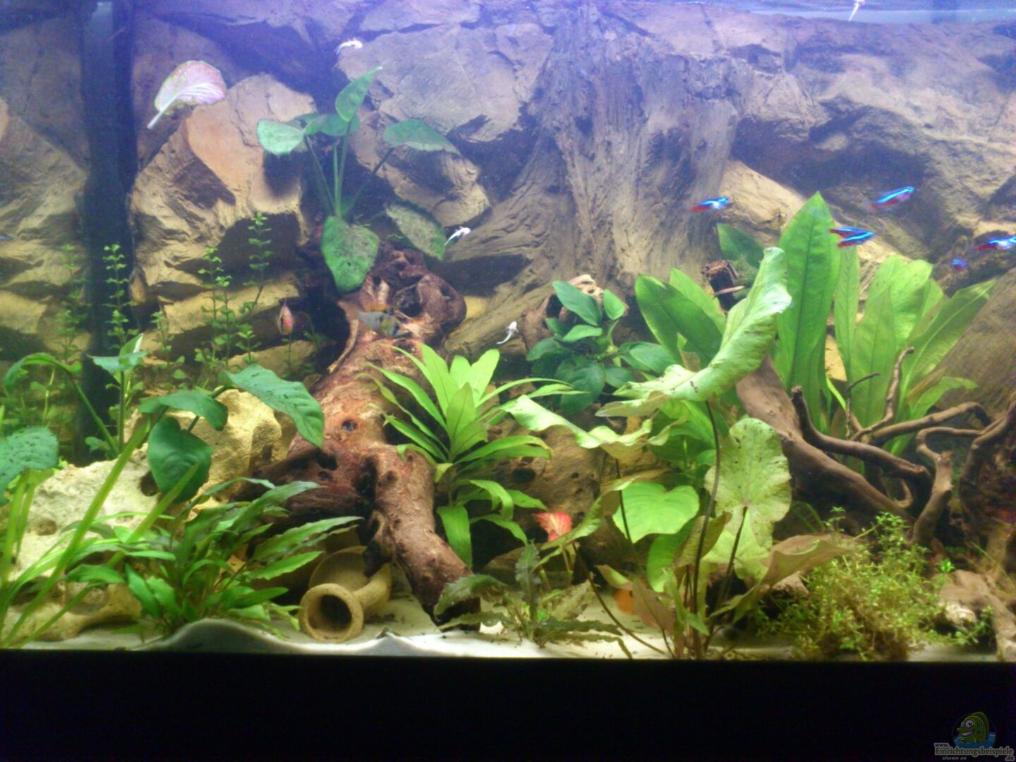 Das Becken hat eine handangefertigte Rückwand, die Felsen und Holz imitiert. Dahinter befindet sich der Heizstab und der Ansauger der Pumpe. Auch können die Fische die Rückwand hinterschwimmen und haben somit eine gute Rückzugmöglichkeit.