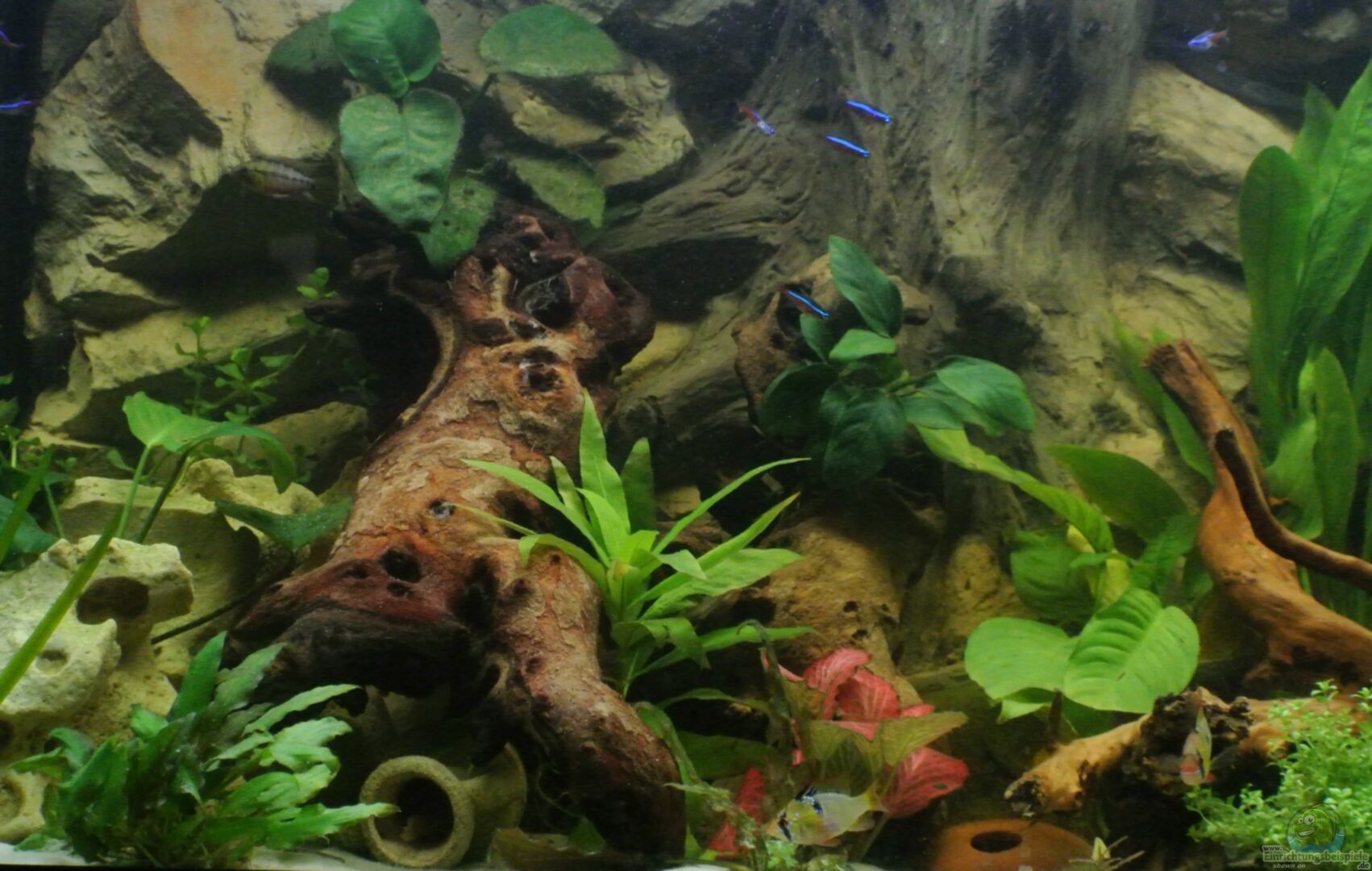Das Becken hat eine handangefertigte Rückwand, die Felsen und Holz imitiert. Dahinter befindet sich der Heizstab und der Ansauger der Pumpe. Auch können die Fische die Rückwand hinterschwimmen und haben somit eine gute Rückzugmöglichkeit.