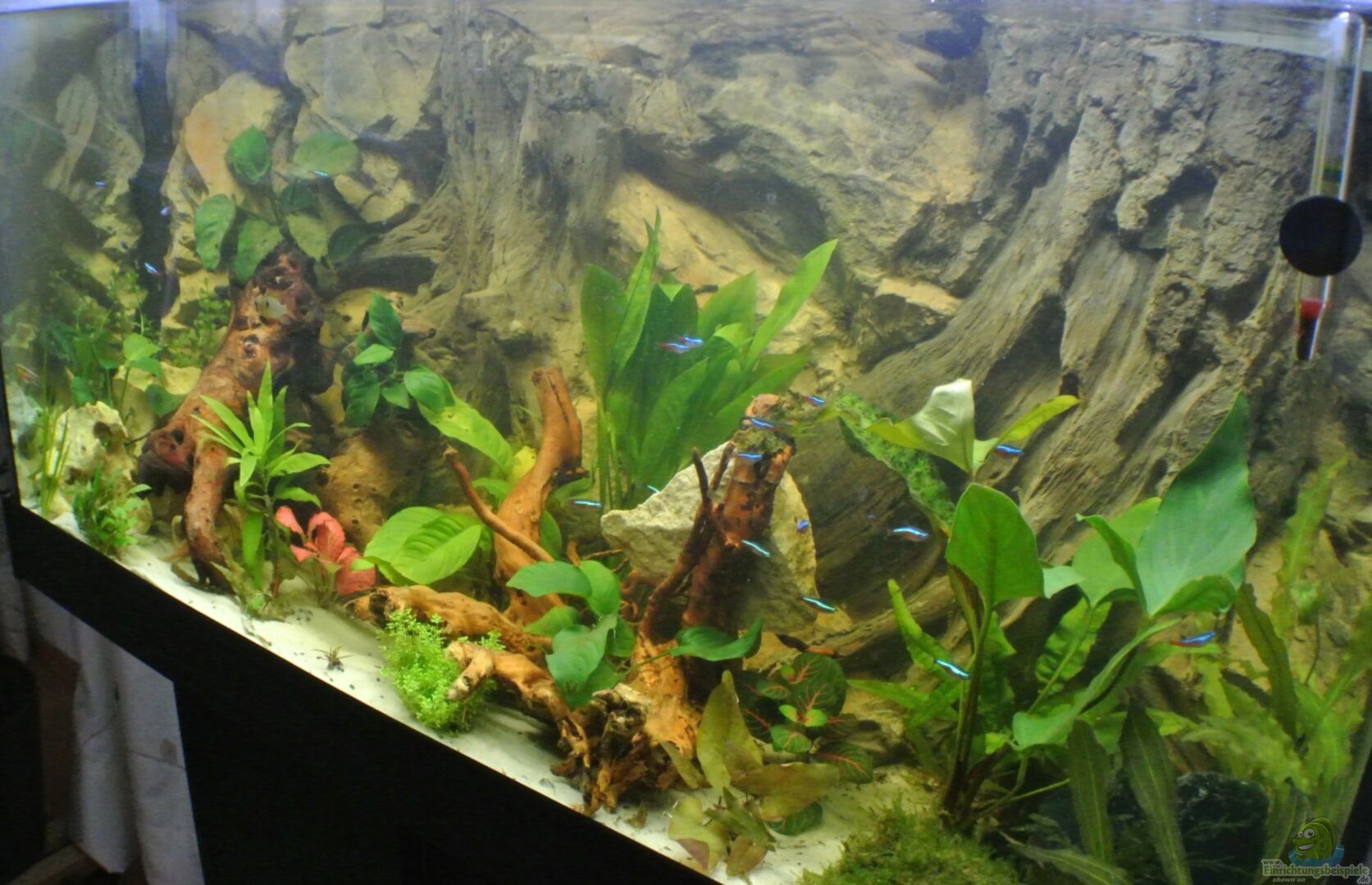 Das Becken hat eine handangefertigte Rückwand, die Felsen und Holz imitiert. Dahinter befindet sich der Heizstab und der Ansauger der Pumpe. Auch können die Fische die Rückwand hinterschwimmen und haben somit eine gute Rückzugmöglichkeit.