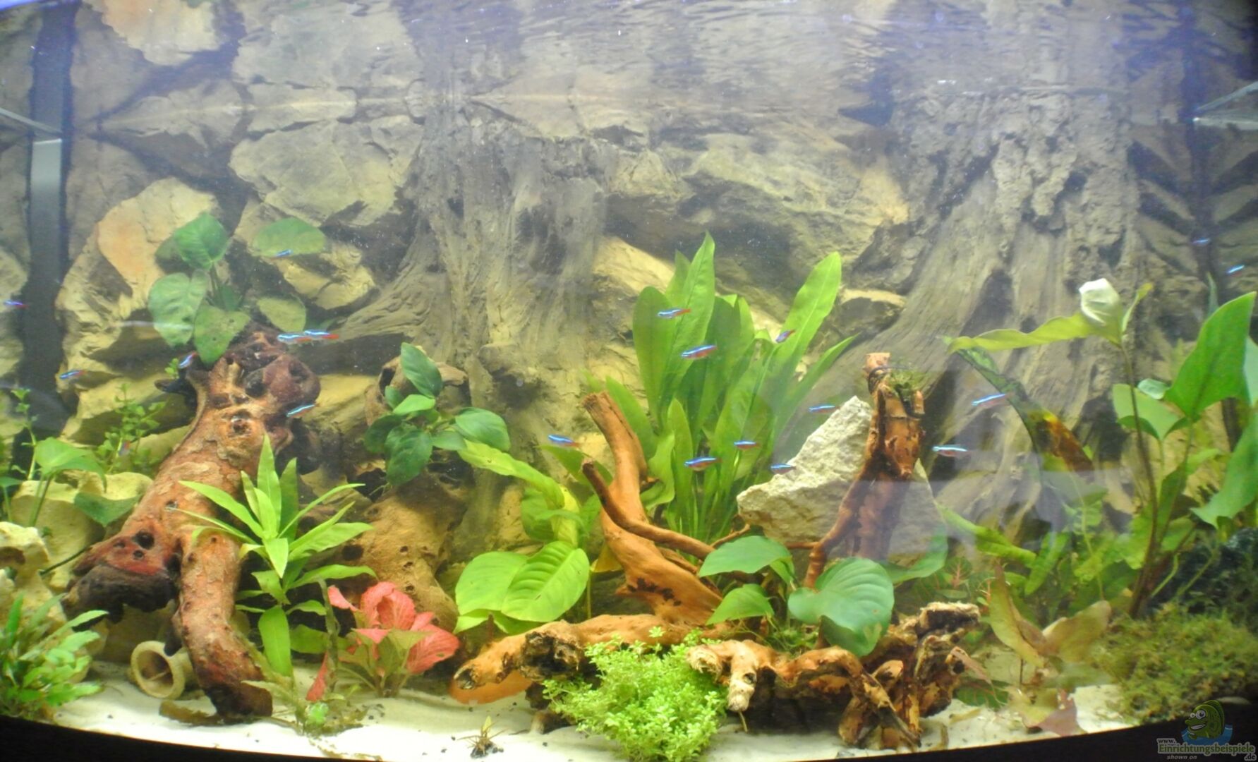 Das Becken hat eine handangefertigte Rückwand, die Felsen und Holz imitiert. Dahinter befindet sich der Heizstab und der Ansauger der Pumpe. Auch können die Fische die Rückwand hinterschwimmen und haben somit eine gute Rückzugmöglichkeit.