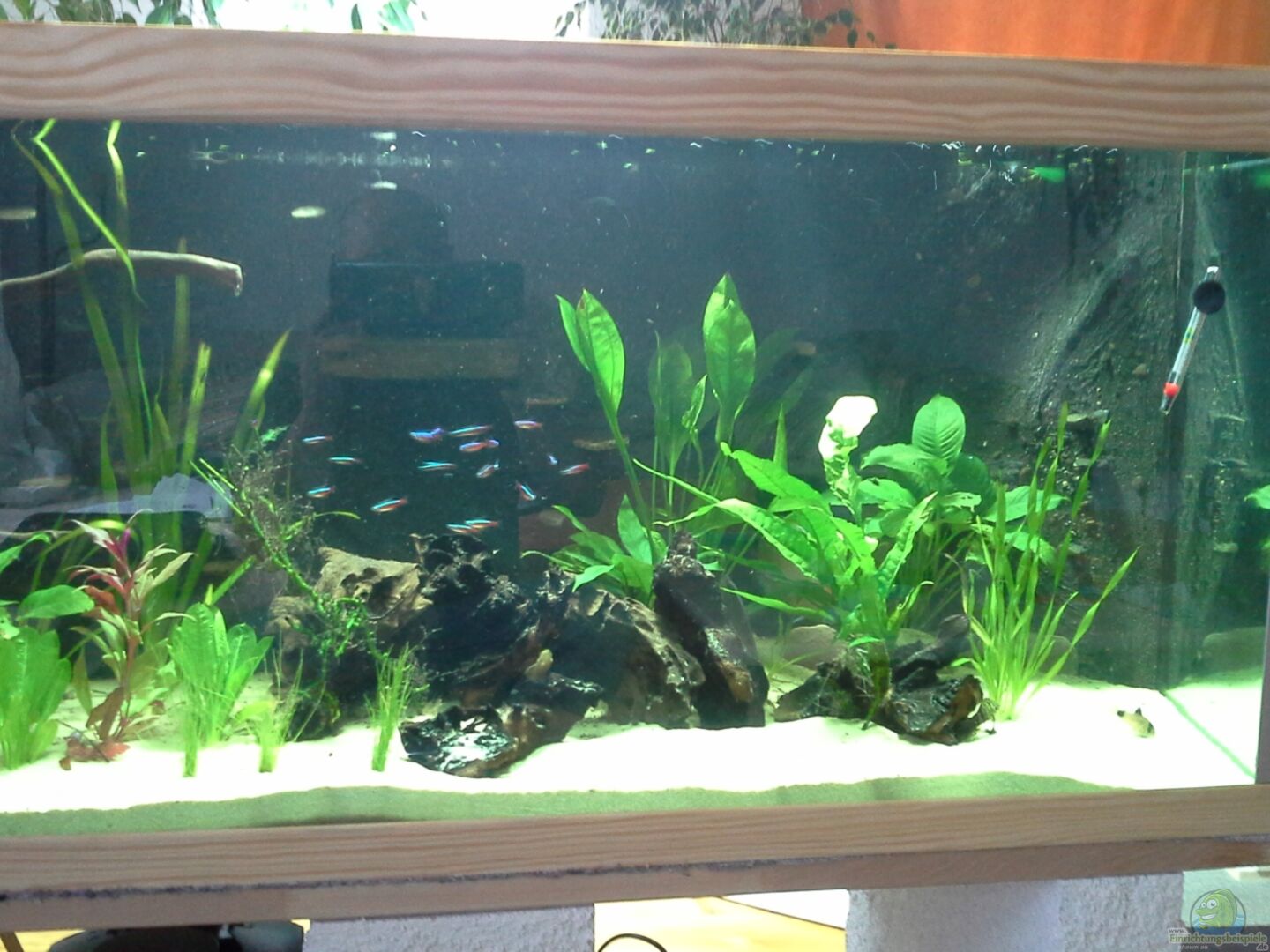 Das aquarium ist marke eigenbau, also ein altes becken komplett auseinadergeholt und neu verkebt, die rueckwand ist aus daemmplatten die mit kunstharz bearbeitet wurde.oben und unten wurden leisten in fichtenholz angebracht und an den ecken wurden aluleisten angeklebt.die obere abdeckung besteht aus plexiglas, die dreimal unterteilt ist.Selbst eingeklebte 3d rueckwand. An den seiten wurden ecken fuer diverse technik eingeklebt. Das becken läuft seit 5.2013 . Einen monat später kam der besatz. Co [...]