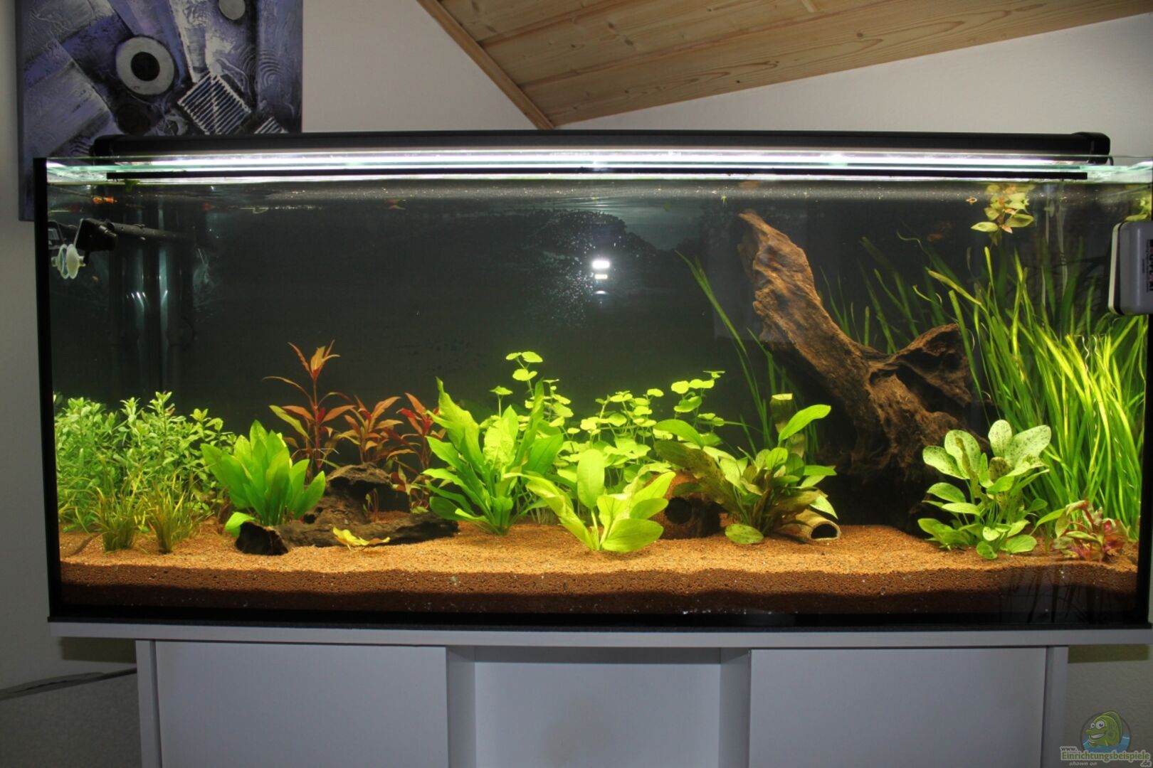 Schwarze Rückwandfolie Unterschrank ist von Juwel. Das Becken ist nur mit einer Glasplatte abgedeckt damit der Wärmeverlust und die Verdunstung geringer ist.