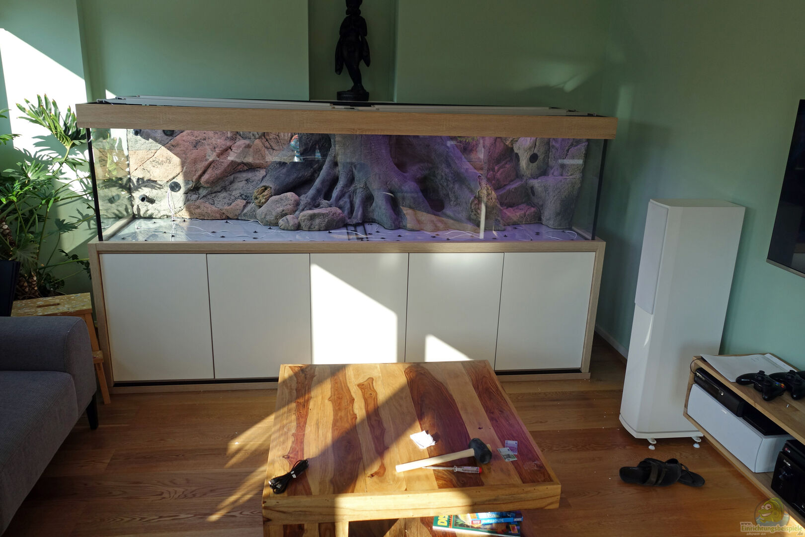 Aquarium in der Variante "PREMIUM STAR" vom Aquarienkontor aus Haltern am See mit einer Back to Nature Rückwand Amazonas, verlängert mit einer BtN Rocky, um die volle Breite von 250cm abzudecken. Wei??glas-Frontscheibe Die Seiten hinter der Rückwand schwarz silikonisiert. Die Kombination steht auf einer separaten Siebdruckplatte zur optimalen Gewichtsverteilung und zum bestmöglichen Schutz des Estrichs mit darunterliegender Dämmung.