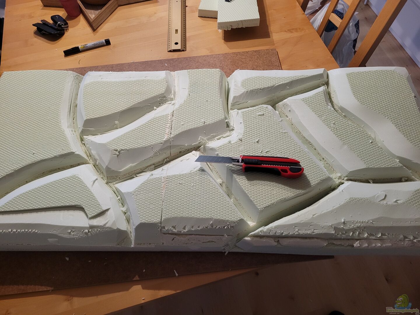 Selbstgebaute Rückwand und Module aus Styrodur und 10kg Silbermanns Scaper Cement sowie 10 Rockzolid Komodo Riverstones. In der Rückwand und ebenso in den Modulen sind Betongewichte verbaut und vergossen, im den Auftrieb deutlich zu verringern. Verklebt wurde das ganze dann mit dem Kompositkleber von Back to Nature. Effektiv blieben vom ursprünglichen Beckeninhalt dann etwa 200l netto übrig. Die Rückwand ist wesentlich schlanker, als sie rüberkommt. Sollte auf den Bildern mit dem Cuttermesser [...]