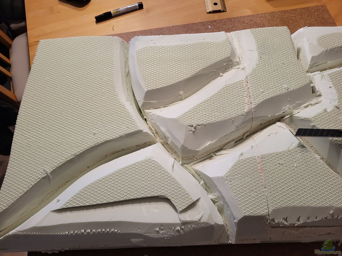 Selbstgebaute Rückwand und Module aus Styrodur und 10kg Silbermanns Scaper Cement sowie 10 Rockzolid Komodo Riverstones. In der Rückwand und ebenso in den Modulen sind Betongewichte verbaut und vergossen, im den Auftrieb deutlich zu verringern. Verklebt wurde das ganze dann mit dem Kompositkleber von Back to Nature. Effektiv blieben vom ursprünglichen Beckeninhalt dann etwa 200l netto übrig. Die Rückwand ist wesentlich schlanker, als sie rüberkommt. Sollte auf den Bildern mit dem Cuttermesser [...]