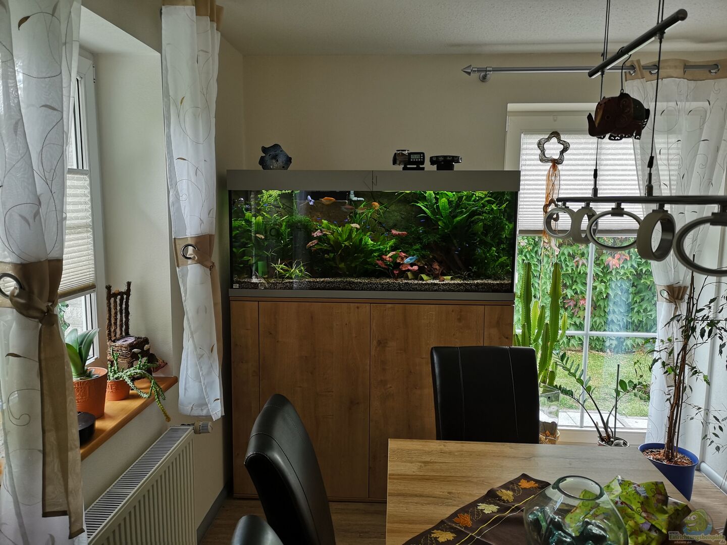 Sonderanfertigung "Brillant Rechteck-Aquarium" mit ungewöhnlichen Ma??en (152 x 52 x 61), 482 Liter Volumen mit ??berlaufschacht und zwei Kammern fast mittig in dem Becken. Unterschrank "Brillant Aquarium" mit 112 cm Höhe. Gesamthöhe der Anlage, Becken mit Unterschrank und Futterautomaten ca. 185cm. Die perfekte Blickhöhe im Esszimmer auf das Becken.