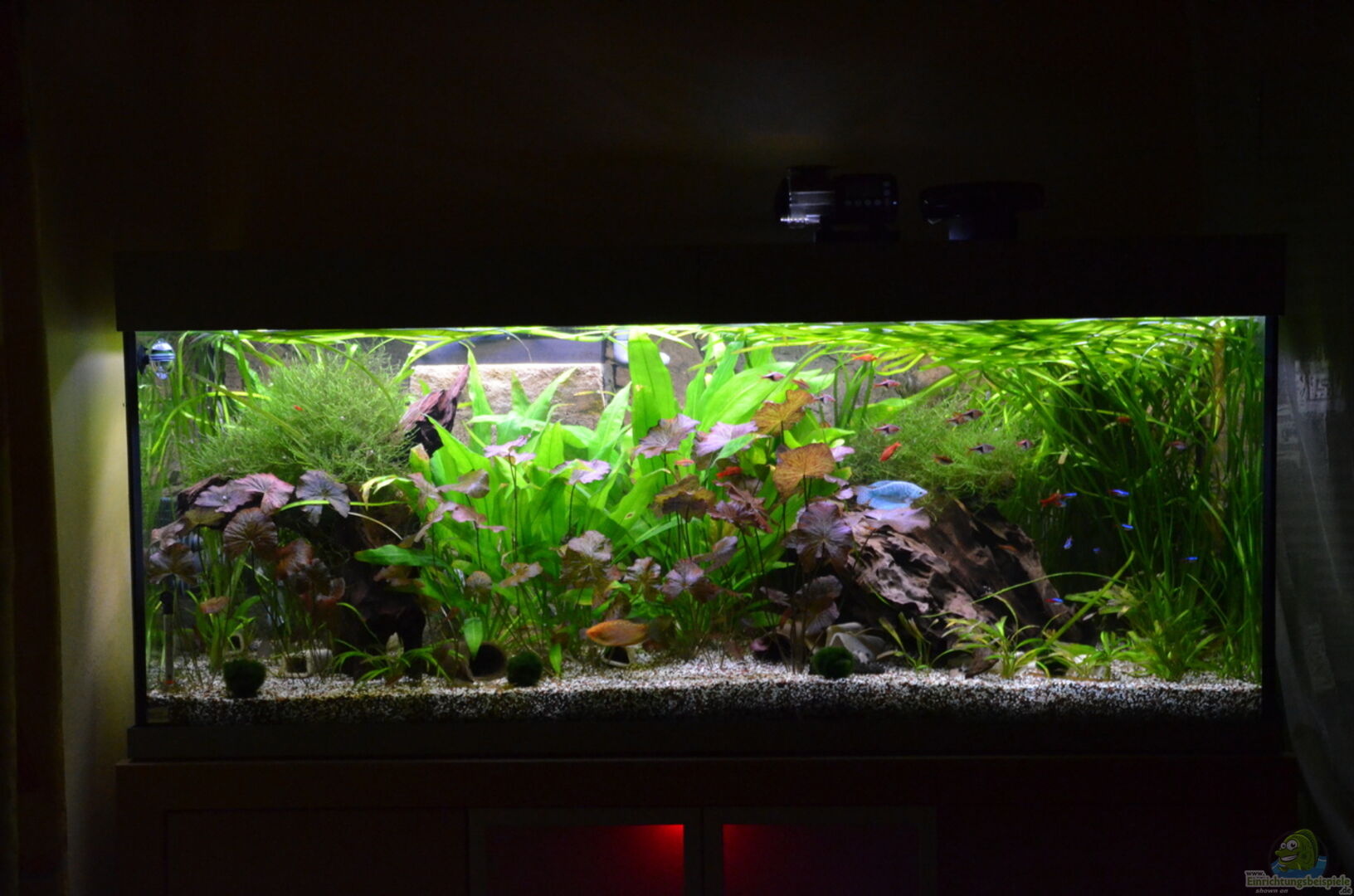 Sonderanfertigung "Brillant Rechteck-Aquarium" mit ungewöhnlichen Ma??en (152 x 52 x 61), 482 Liter Volumen mit ??berlaufschacht und zwei Kammern fast mittig in dem Becken. Unterschrank "Brillant Aquarium" mit 112 cm Höhe. Gesamthöhe der Anlage, Becken mit Unterschrank und Futterautomaten ca. 185cm. Die perfekte Blickhöhe im Esszimmer auf das Becken.