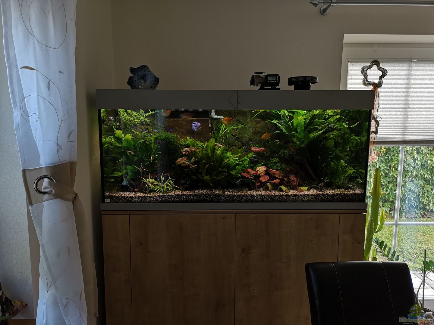 Sonderanfertigung "Brillant Rechteck-Aquarium" mit ungewöhnlichen Ma??en (152 x 52 x 61), 482 Liter Volumen mit ??berlaufschacht und zwei Kammern fast mittig in dem Becken. Unterschrank "Brillant Aquarium" mit 112 cm Höhe. Gesamthöhe der Anlage, Becken mit Unterschrank und Futterautomaten ca. 185cm. Die perfekte Blickhöhe im Esszimmer auf das Becken.