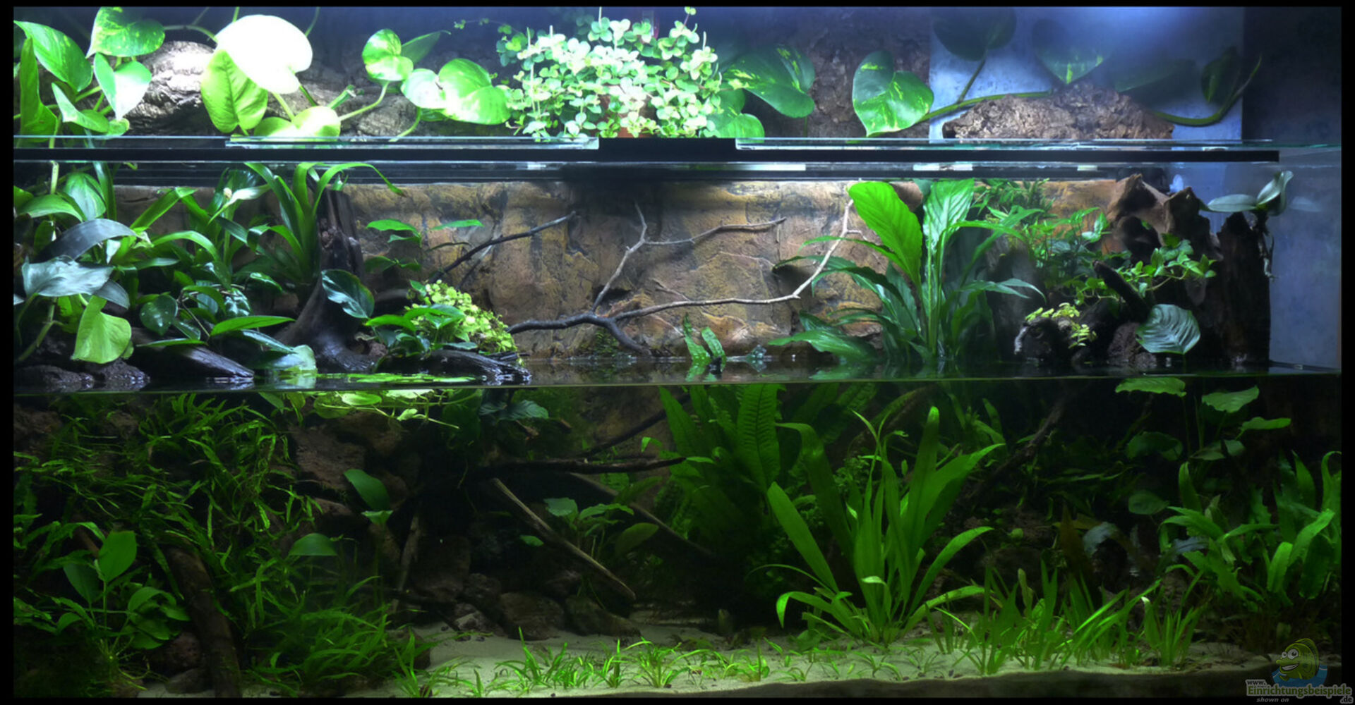 Nach Jahren im Bereich Südamerika und nur sehr mä??iger Bepflanzung wollte ich mal etwas ganz Neues machen. Habe daher die Einrichtungsbeispiele durchstöbert und bin beim Riparium von "serok" hängen geblieben. Gesagt, getan und so ist dann meine eigene Version eines Ripariums / Aquaterrariums entstanden. Wasserstand etwa 30cm, wieviel Wasser jetzt letztendlich im Becken ist, mag ich aber nicht einzuschätzen. Vermutlich irgendwas zwischen 150L und 200L. Aber das ist wirklich nur geschätzt. [...]