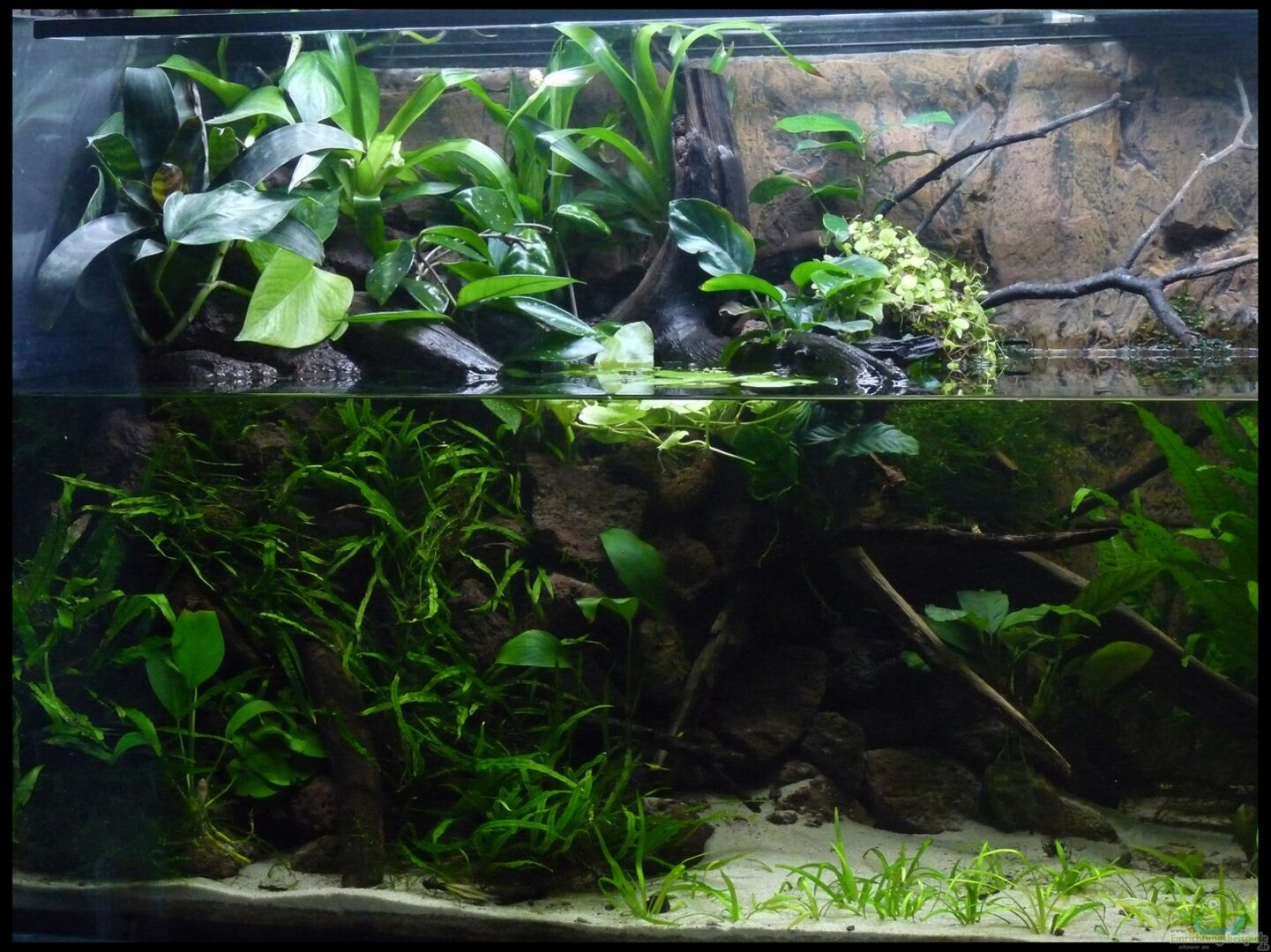 Nach Jahren im Bereich Südamerika und nur sehr mä??iger Bepflanzung wollte ich mal etwas ganz Neues machen. Habe daher die Einrichtungsbeispiele durchstöbert und bin beim Riparium von "serok" hängen geblieben. Gesagt, getan und so ist dann meine eigene Version eines Ripariums / Aquaterrariums entstanden. Wasserstand etwa 30cm, wieviel Wasser jetzt letztendlich im Becken ist, mag ich aber nicht einzuschätzen. Vermutlich irgendwas zwischen 150L und 200L. Aber das ist wirklich nur geschätzt. [...]