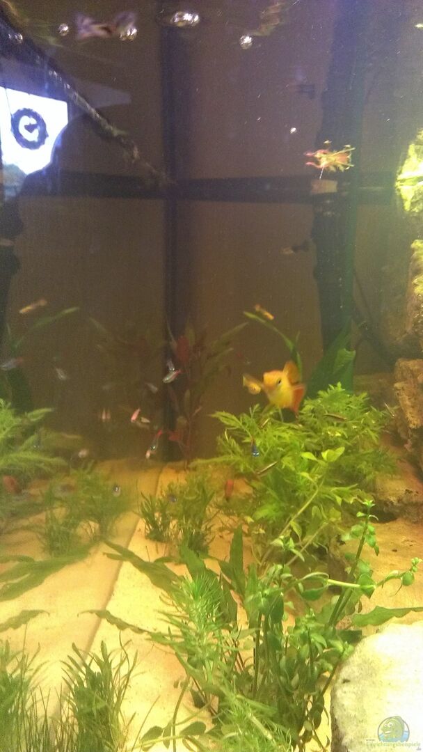 Ansich hat es keine Besonderheiten, das einzige ist die Rückwand und ein teil des Bodens. Es ist aus Styropor und Kunststoff angefertigt und mit Grauerfarbe gestrichen. Am Boden wurden damit 3 Hölen angefertigt. Die Struktur der Rückwand soll eine Fels (Stein) wand darstellen. Der Aquarienschrank wurde selbstgebaut aus Fichtenholz. Er hat 2 Türen (links und rechts)