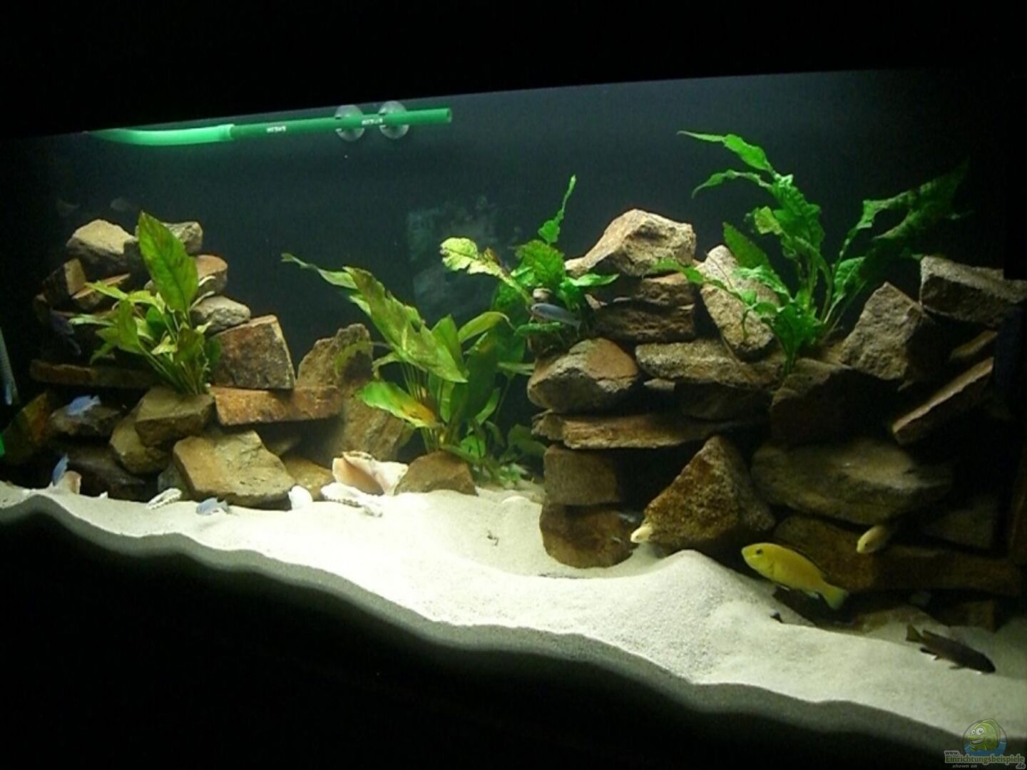 Habe die Rückwand sowie die Au??enwände von au??en mit schwarzem, matten Acryllack gestrichen. Dadurch wirkt das Aquarium sehr tief und die Farbe der Fische kommt sehr gut zur Geltung. Das Aquarium ist sto??verklebt. Das Becken steht auf einem sehr stabilen Unterschrank aus Echtholz mit extrem hoher Tragkraft. Zwischen Aquarium und Unterschrank befindet sich eine Schaumstoffmatte. Um dem hohen Gewicht der Steine standhalten zu können habe ich den Aquariengrund mit Plexiglasscheiben [...]