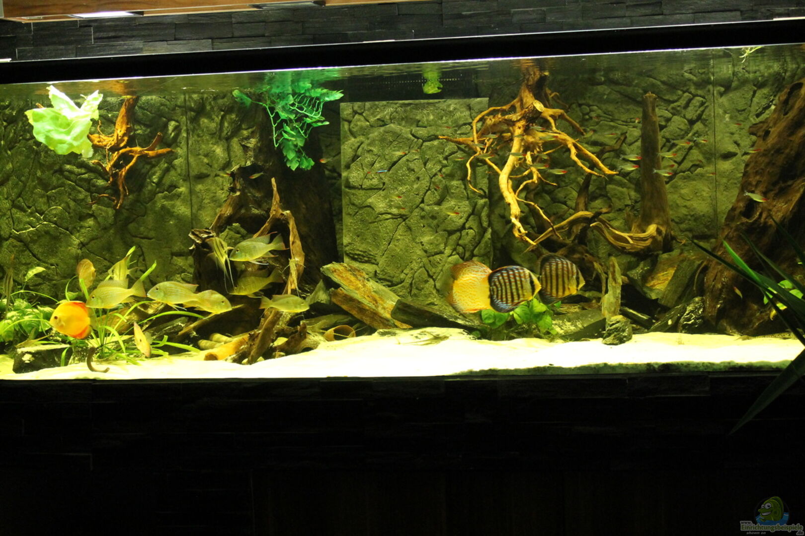Das Becken ist eine Sonderanfertigung aus 15mm starken Floatglas mit Wasserstandsblenden aus Schwarzglas. Mittig an der Rückwand wurde ein Doppelwändiger Filterschacht mit bodennaher Ansaugung und ??erlauf eingeklebt. Im Schacht befinden sich zwei 55mm Lochbohrungen. 1x für den Filtereinlauf und 1x als Notüberlauf. Eine dreiteilige Glasabdeckung mit kleinen Futteröffnungen verhindert eine grö??ere Wasserverdunstung. Der Aquariumunterschrank wurde aus Ziegelsteinen selbst gemauert und durch [...]