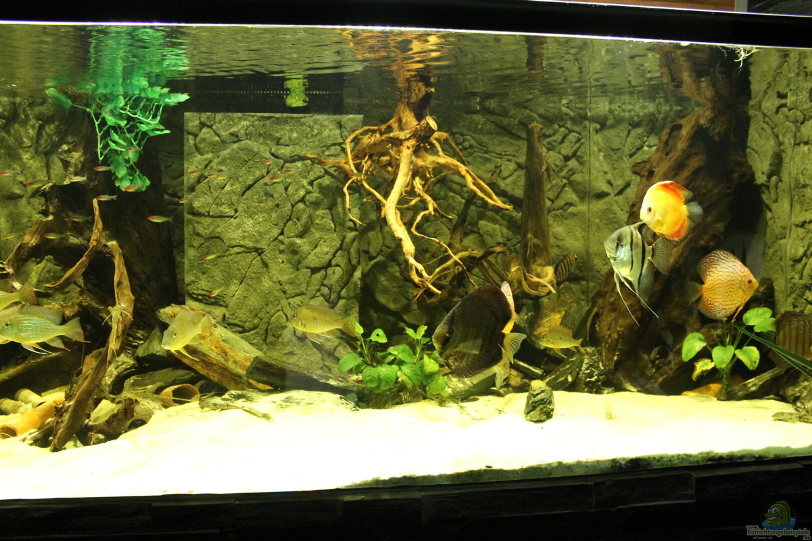 Das Becken ist eine Sonderanfertigung aus 15mm starken Floatglas mit Wasserstandsblenden aus Schwarzglas. Mittig an der Rückwand wurde ein Doppelwändiger Filterschacht mit bodennaher Ansaugung und ??erlauf eingeklebt. Im Schacht befinden sich zwei 55mm Lochbohrungen. 1x für den Filtereinlauf und 1x als Notüberlauf. Eine dreiteilige Glasabdeckung mit kleinen Futteröffnungen verhindert eine grö??ere Wasserverdunstung. Der Aquariumunterschrank wurde aus Ziegelsteinen selbst gemauert und durch [...]
