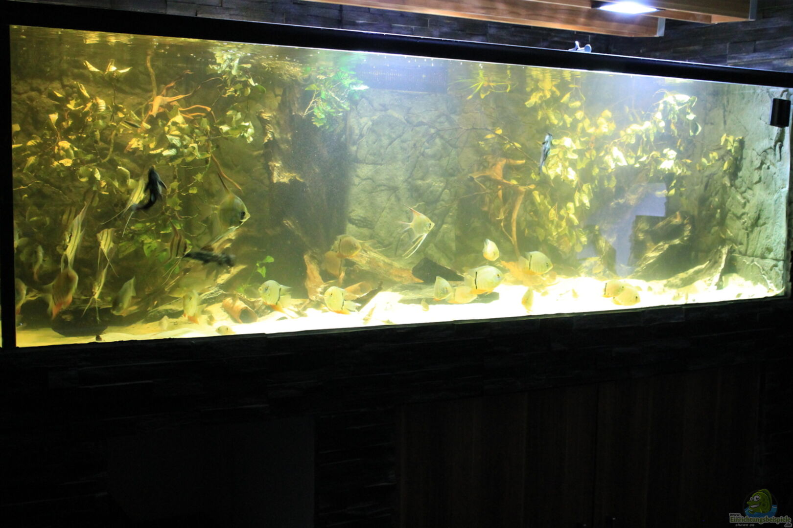 Das Becken ist eine Sonderanfertigung aus 15mm starken Floatglas mit Wasserstandsblenden aus Schwarzglas. Mittig an der Rückwand wurde ein Doppelwändiger Filterschacht mit bodennaher Ansaugung und ??erlauf eingeklebt. Im Schacht befinden sich zwei 55mm Lochbohrungen. 1x für den Filtereinlauf und 1x als Notüberlauf. Eine dreiteilige Glasabdeckung mit kleinen Futteröffnungen verhindert eine grö??ere Wasserverdunstung. Der Aquariumunterschrank wurde aus Ziegelsteinen selbst gemauert und durch [...]