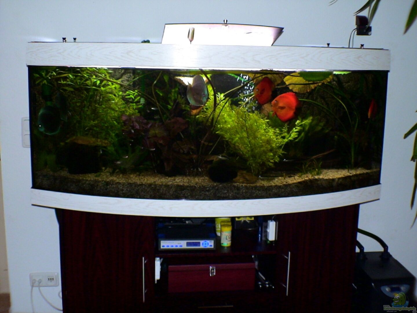 Rüchwand: Juwel Motiv Rock Unterschrank leicht verändert ( mit Folie beklebt, zusätzliche Fächer mit Tür eingebaut ) Für die Filter sind in den Unterschrank abschaltbare Steckdosen montiert, die Filter und Heizung abschalten Aquarium mit gewölbter Scheibe