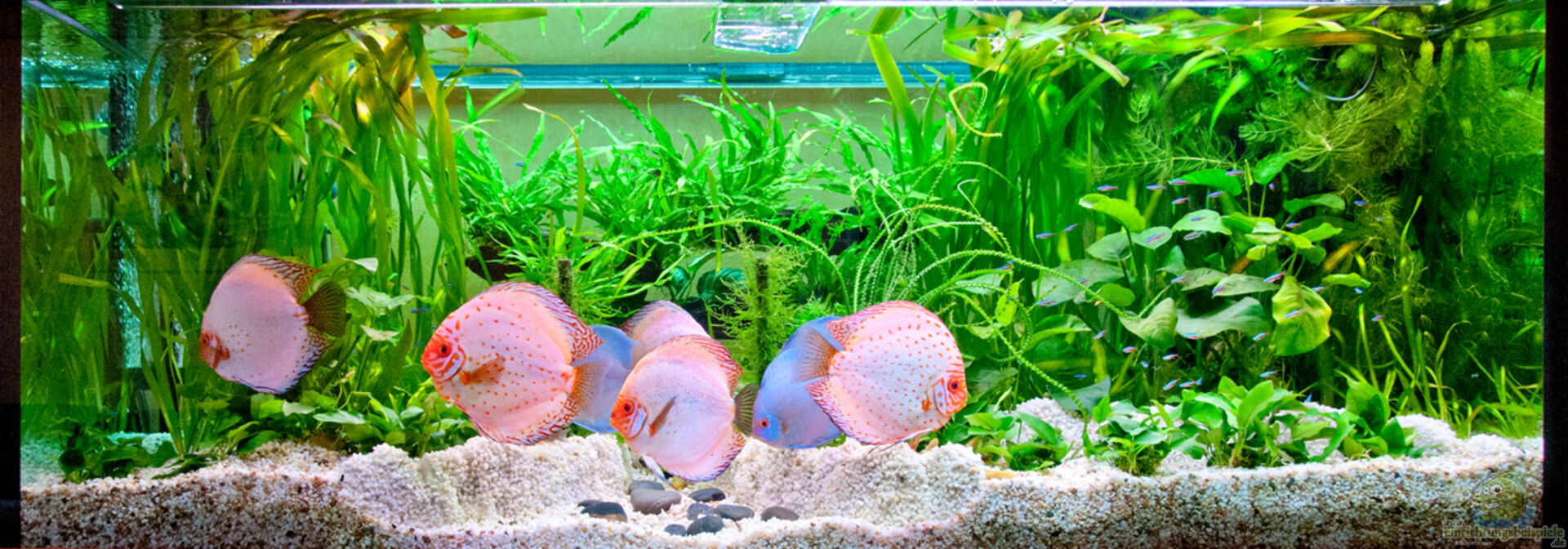 Mein Aquarium ist in einem stabilen Gleichgewicht. Die meisten Pflanzen sind langsam wachsend, da braucht man nicht viel zu tun. Die Vallisnereien werden etwas eingekürzt, sobald sie lang genug sind. Das Aquarium ist eine Sonderanfertigung, keine Bohrungen, so bin ich flexibler. Bodengrund, Filter und Wasser wurden von einem Aquarium übernommen, dass seit August 2010 lief.