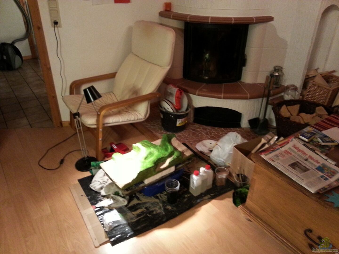 Rückwand selber gebaut mit Höhlen und hinter schwimmbar 2 x Tonröhren 3 x Wurzeln 1 x Lochgestern