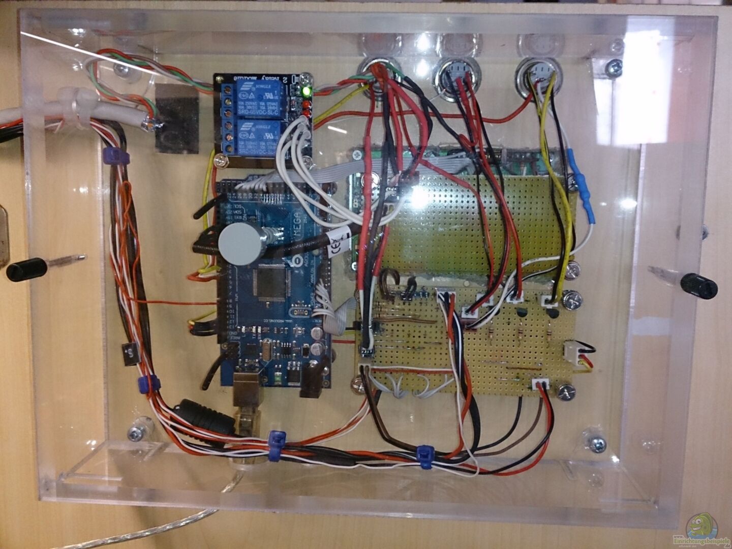Im Unterschrank befindet sich noch eine UV-C Lampe die nach der Zirkulationspumpe geschalten ist. Desweiteren ist der Wasserdichte Sicherungskasten darin, ein selbsgebauter Zeolitfilter etwas Zubehör. Die Arduino Steuerung befindet sich auch im Unterschrank sowie die neue Dosieranlage von GroTech (TEC 4 NG) die ich am 01.10.14 in Betrieb genommen. Im Oberschrank ist die Strömungspumpen Technik sammt Multicontroller von Tunze installiert, und die LED Beleuchtungstechnik von Maxpeckt. [...]