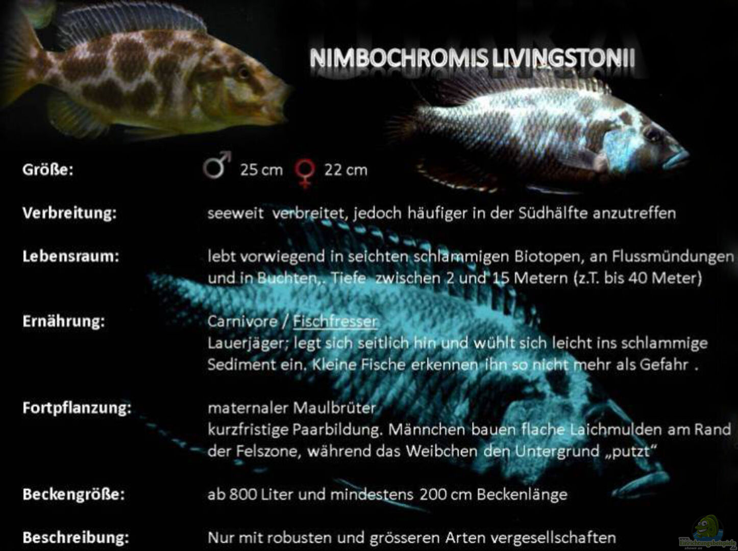 Der Besatz: Nimbochromis livingstonii (1/2) Hinweis zu dieser Art! Dieser ist nur solange hier im Becken bis das 300 cm Becken im Herbst kommt ! Daher für alle anderen... diese Beckengrö??e ist nicht geeignet für diese Art um sie langfristig drin pflegen zu können. Stigmatochromis melanchros (1/1) F1 Astatotilapia calliptera 1/3 (F1) Einer der gro??en Ausnahmen welche weder zu den Mbunas noch zu den Nonmbunas im Malawisee gezählt werden, in der Natur [...]