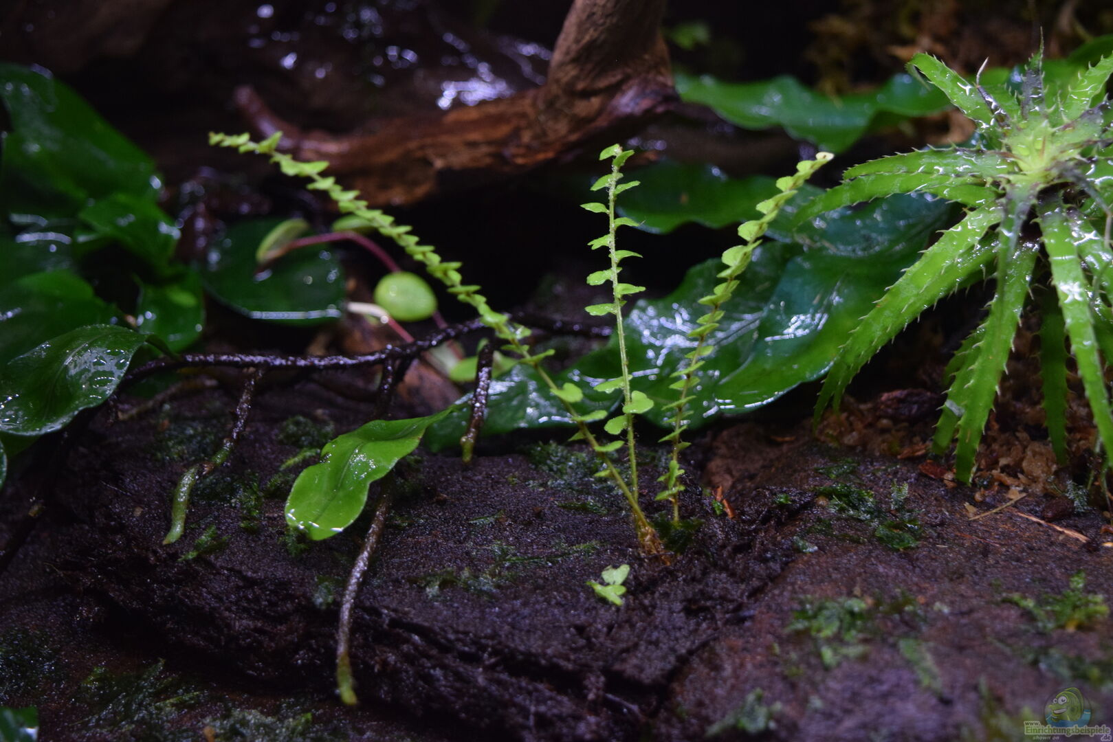 Ferns/Farne: Pyrrosia lanceolata, Selaginella unicata, Polypodium formosanum, Microgramma nitida Bromeliads/Bromelien: Neoregelia Hannibal, Neoregelia Fireball, Cryptanthus microglazioui Bodendecker/Ground plants: Bucephalandra spec. Green Velvet, Anubias bartei var. nana Mosses/Moose: Taxiphyllum barbieri, Leptodictyum riparium, Orchids/Orchideen: Barbosella cogniauxiana, Pleurothallis macroblepharis, Kletterer/Climbing plants: Ficus scandens, Epipremnum spec., Ficus punctata