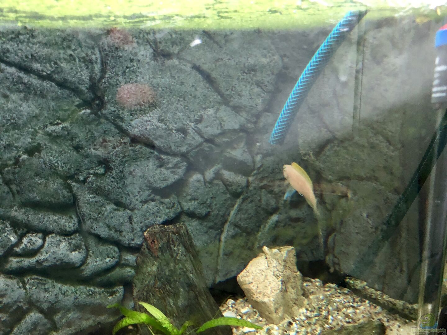 1.2.x Paracyprichromis nigripinnis (die Jungfische wachsen sehr gut) 3.1.x Neolamprologus caudopunctatus (ein Pärchen, das fleißig brütet) 0.1 Ancistrus spec. (älteres Tier, das hier seinen Platz fand)