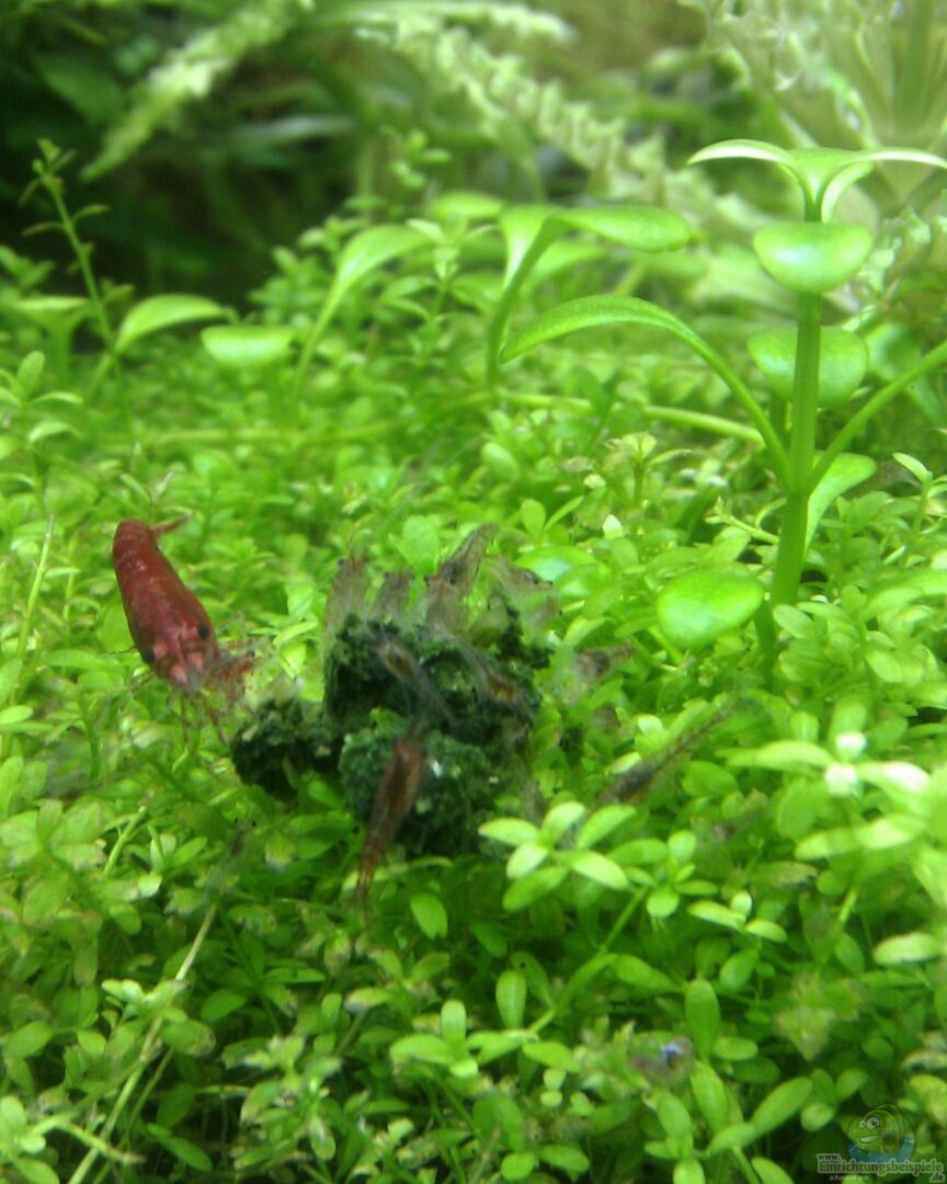 12-14 gro??e Sakura Garnelen mittlerweile etliche Jungtiere drei Geweihschnecken beim Kauf des Besatzes waren auch drei mini Jungtiere im Beutel, die natürlich mit ins Becken kamen. Sie entpuppten sich aber als zwei rote Tigergarnelen und eine schwarze Bienengarnele.
