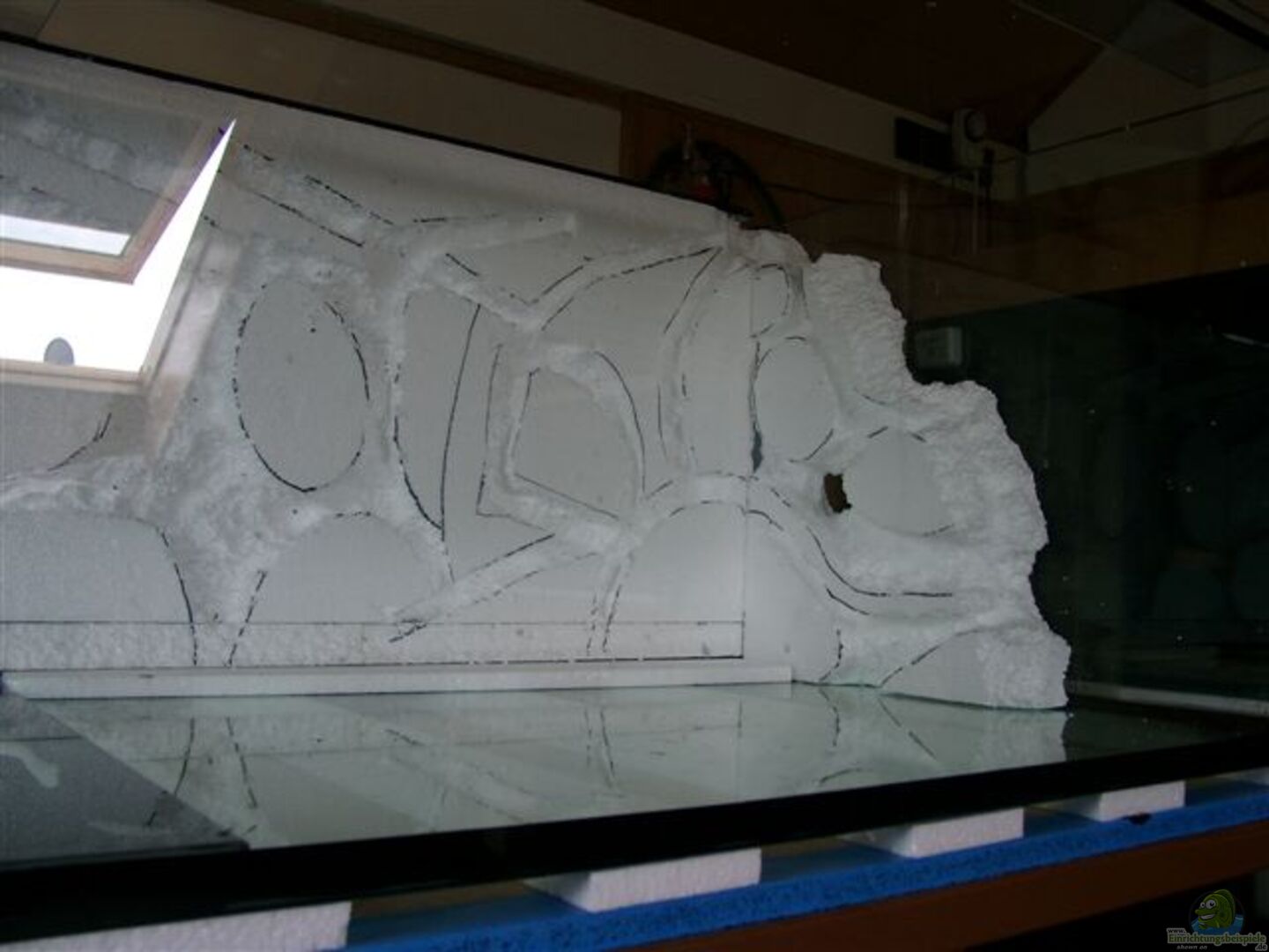 ca. 200-300 kg verschiedene Steine welche entlang der ganzen Rückwand zu einem Haufen gestapelt sind welcher bis zur Wasseroberfläche reicht