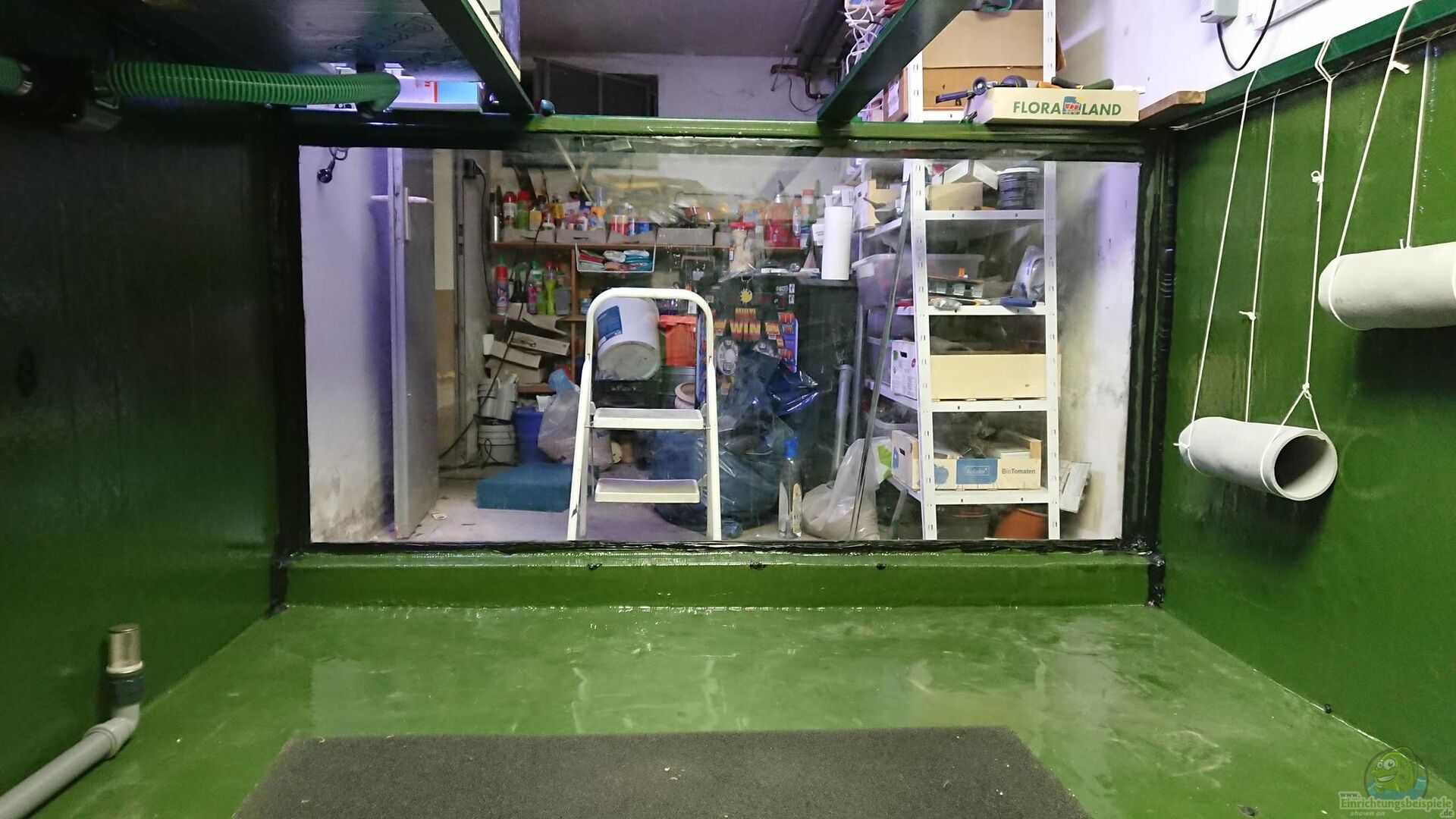 Das Becken besteht aus GFK und einer Frontscheibe. Ein Kellerraum ist durch die Frontscheibe abgetrennt worden und dahinter wurde dann mit Glasfasermatten und Epoxidharz das Becken gebaut. Die Filterung steht oberhalb des Beckens und besteht aus zwei 130cm Filterbecken.