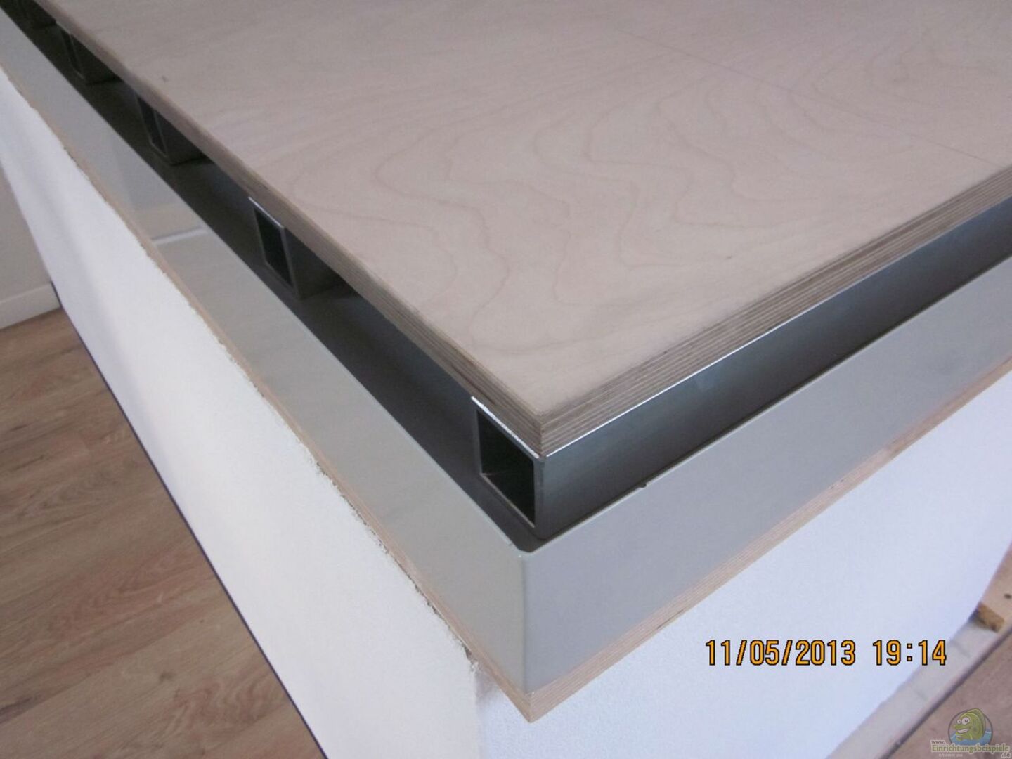 Dies Becken ist eine Ma??anfertigung in 15mm Floatglas und wurde Vorort verklebt. Das Becken steht in einer Wanne, die an den Abfluss angeschlossen ist. An einer Stirnseite gibt es 5 Bohrungen. - Hier ist der Tunze WallOverflow montiert. - Notüberlauf direkt in den Ablauf - Servicezugang für die Mulmglocke. Ebenfalls direkt in den Abfluss - Frischwasserzulauf. - Wasserrücktransport vom Filterbecken Abgedeckt wird das Becken über Schiebescheiben, die in Alu Sonderprofilen laufen. Umbaut [...]