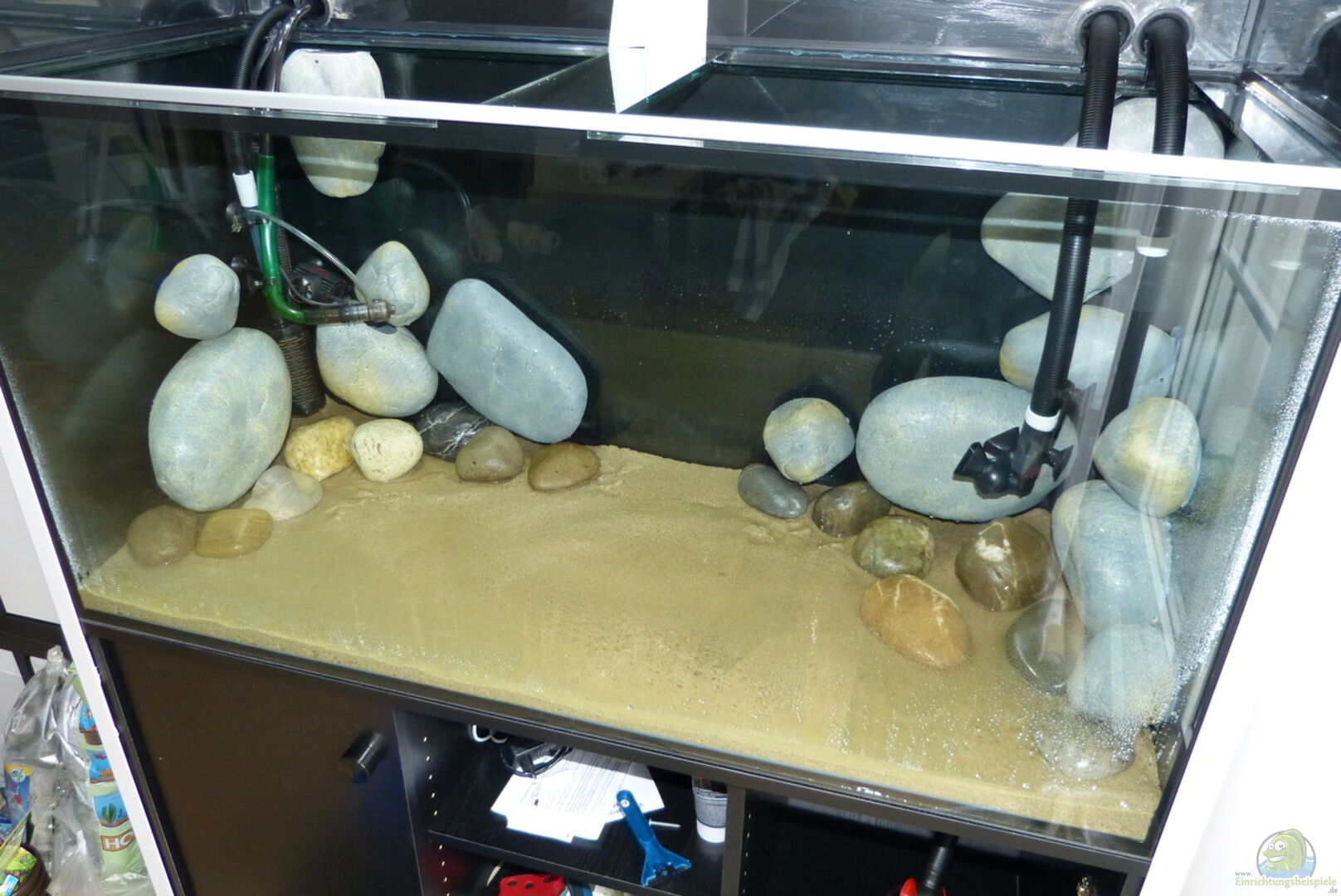 - Rückwand Wasserteil: * bestehend aus schwarzer Rückwand hinter dem Becken und Aqua Della Steinen im Becken in Bodennähe an den Seitenwänden und der Rückwand verklebt. Die Steine sind Innen hohl und dienen Somit als Höhlen für die Ringelhandgarnelen und Welse. - Rückwand Landteil: * im Landteil besteht die Rückwand ebenfalls aus schwarzem Hintergrund und aus 2 Rückwandmodulen von Steinzeit-Design. - Moorkienwurzeln in verschiedenen Grö??en - Korkenzieherhaselnussäste [...]