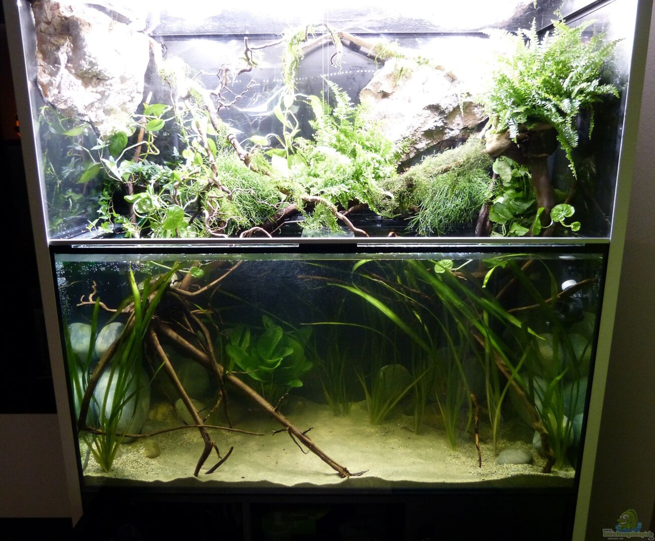 - Rückwand Wasserteil: * bestehend aus schwarzer Rückwand hinter dem Becken und Aqua Della Steinen im Becken in Bodennähe an den Seitenwänden und der Rückwand verklebt. Die Steine sind Innen hohl und dienen Somit als Höhlen für die Ringelhandgarnelen und Welse. - Rückwand Landteil: * im Landteil besteht die Rückwand ebenfalls aus schwarzem Hintergrund und aus 2 Rückwandmodulen von Steinzeit-Design. - Moorkienwurzeln in verschiedenen Grö??en - Korkenzieherhaselnussäste [...]